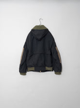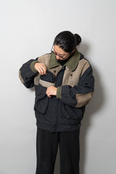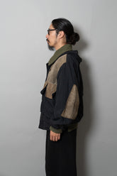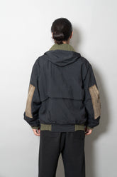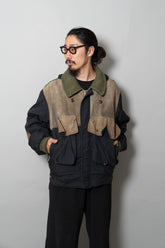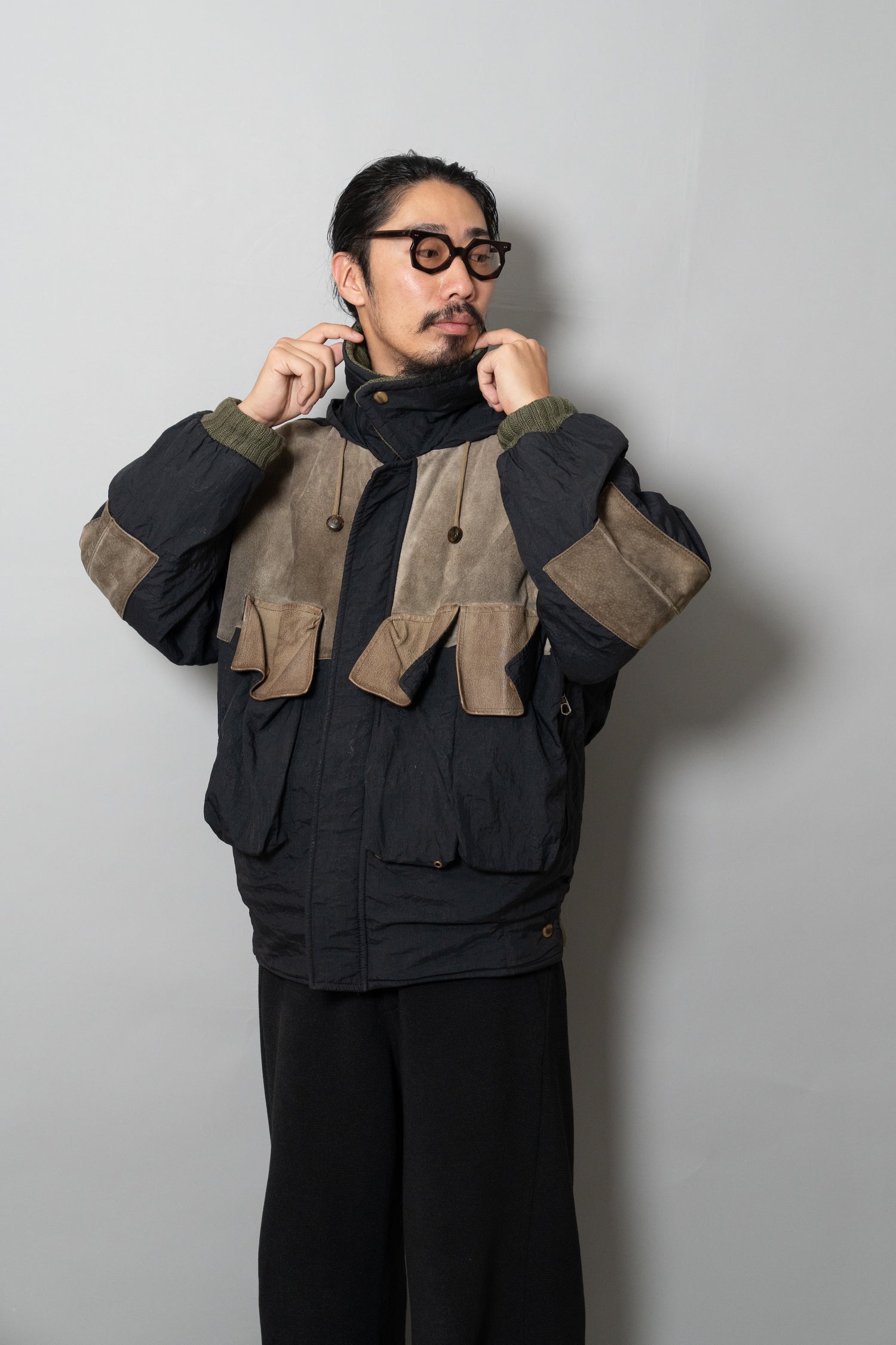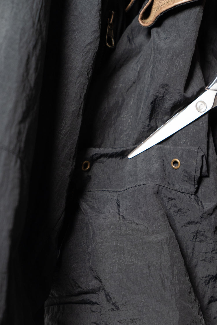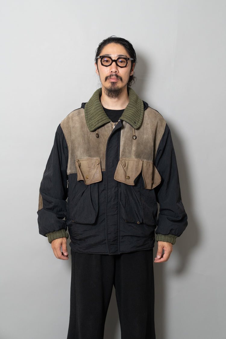 デザインは、クラシックなフィールドジャケットをベースにしています。4つのフラップポケットは収納性とユーティリティを強調し、フロントは比翼仕立てで風の侵入を防ぐ仕様。さらに特徴的なのが、スエードレザーを部分的に切り替えたコンビネーションです。ショルダー、エルボー、そして胸ポケットのフラップなど、摩耗しやすい部位にレザーを配置することで耐久性を向上させると同時に、ナイロンの光沢とのコントラストが独特の表情を生み出しています。これはミリタリーウェアの実用性と、ファッションとしての造形美を高次元で両立させたオスティならではのアプローチです。