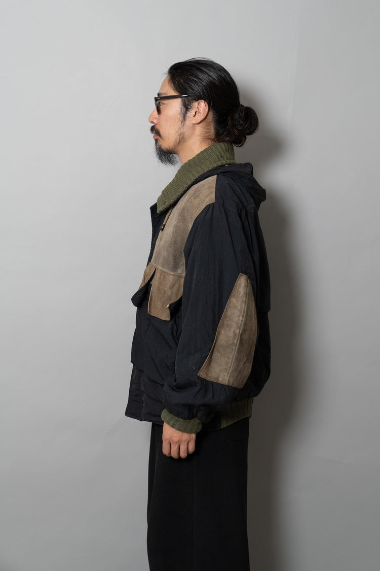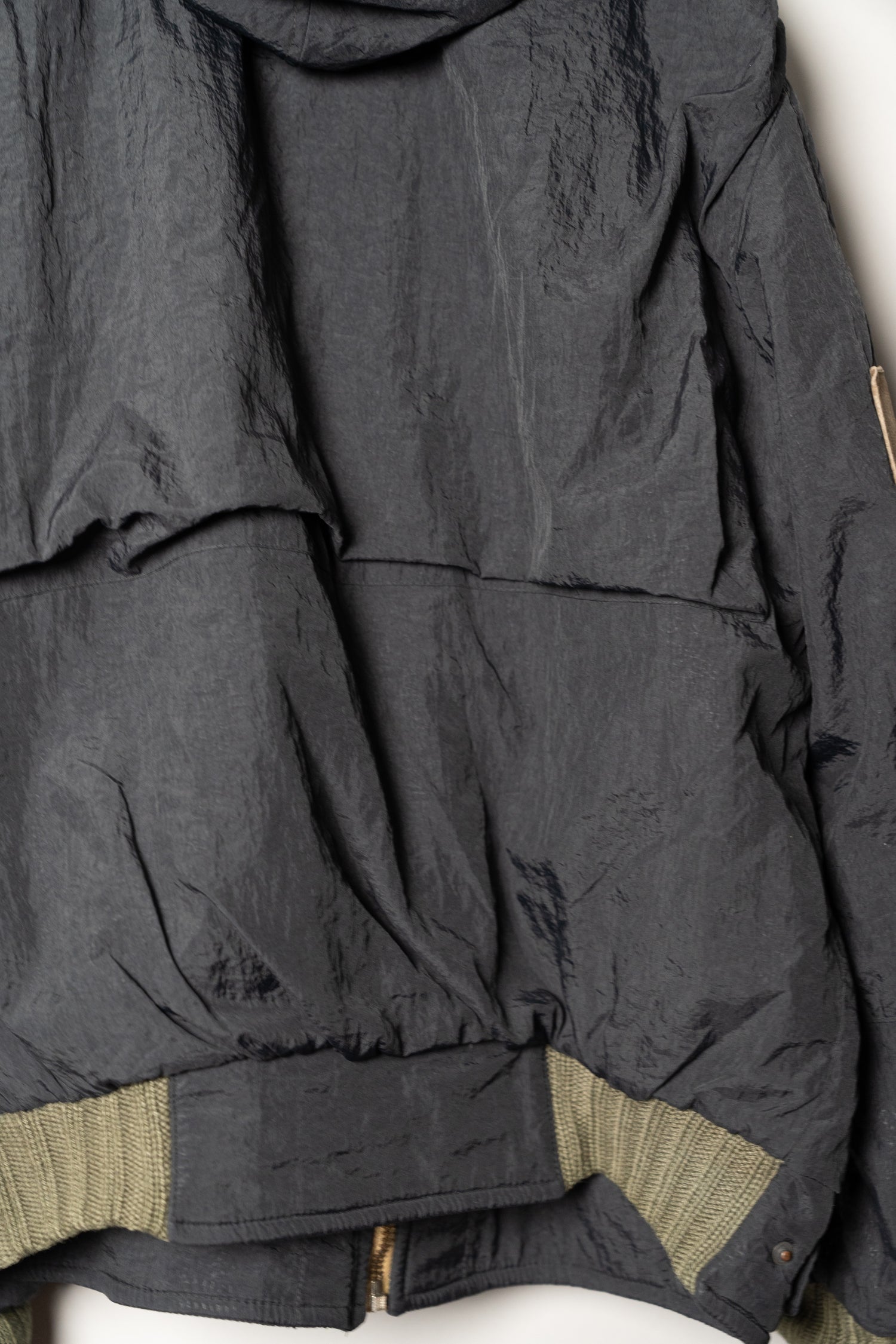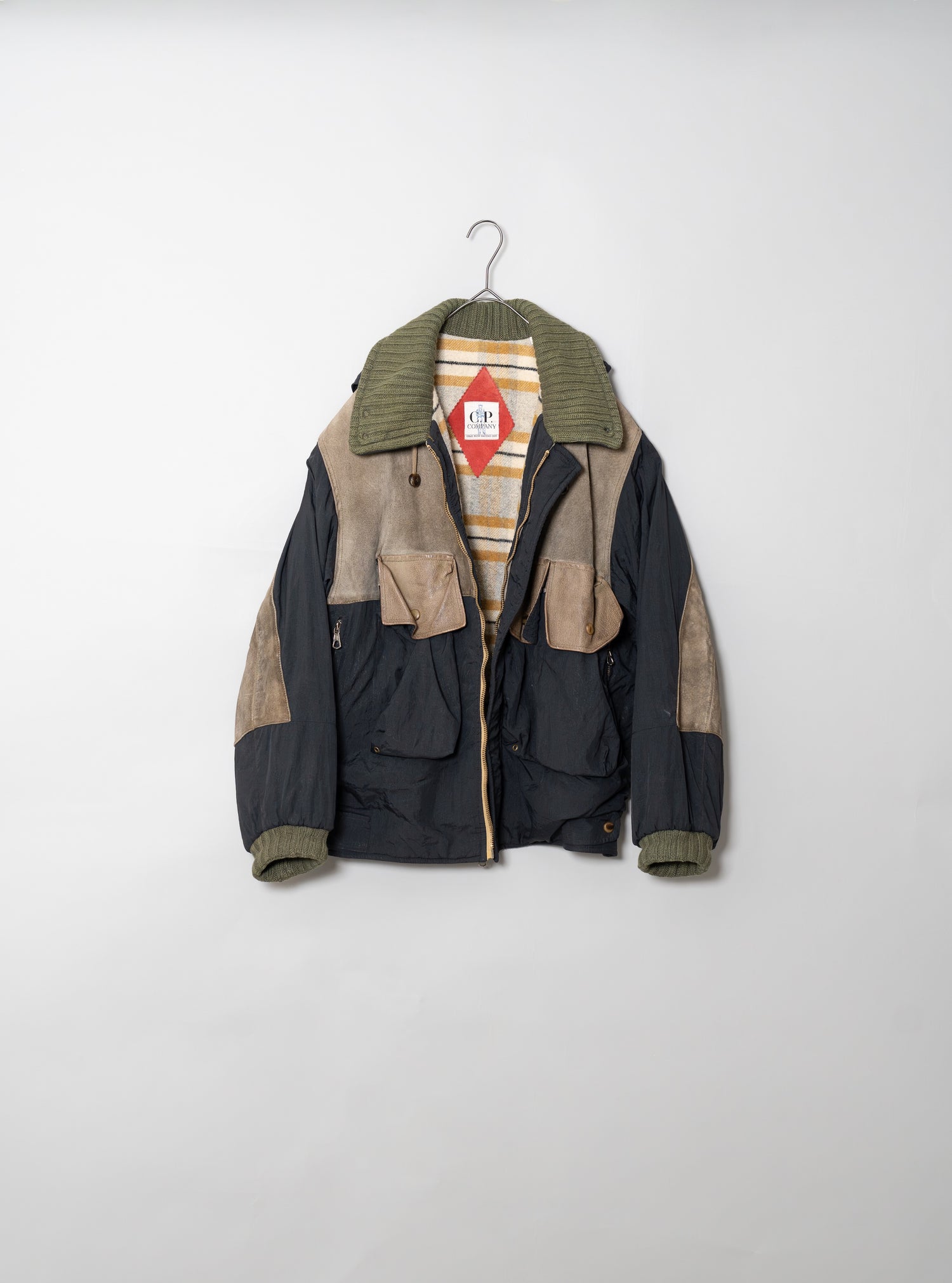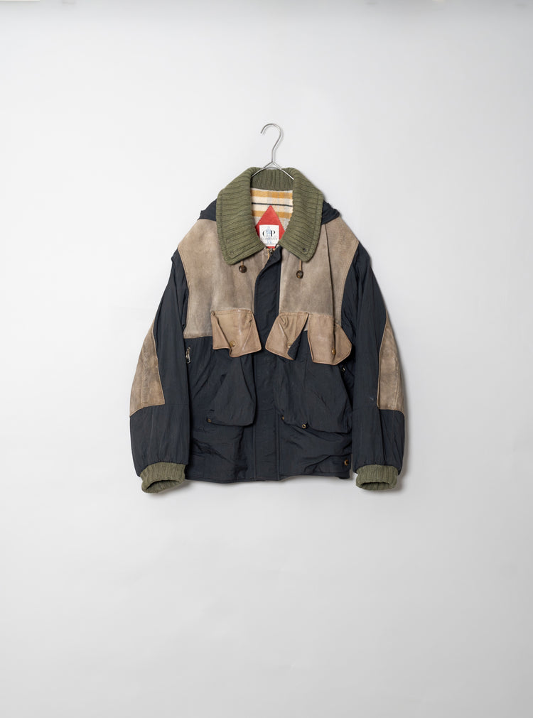 オスティが提唱した「ガーメントダイ(製品染め)」技術も、この時期にはすでにC.P. COMPANYの代名詞となっていましたが、本作は合成繊維であるナイロンと、天然皮革やニットといった異素材を組み合わせた先鋭的な試み。製品染めを行う際、素材ごとの染まり方が異なるため、意図的に生まれる色の濃淡やムラ感が一着ごとに個性を与えます。これにより、まるで一点物のような佇まいを獲得し、量産品でありながら工芸品のような存在感を放ちます。