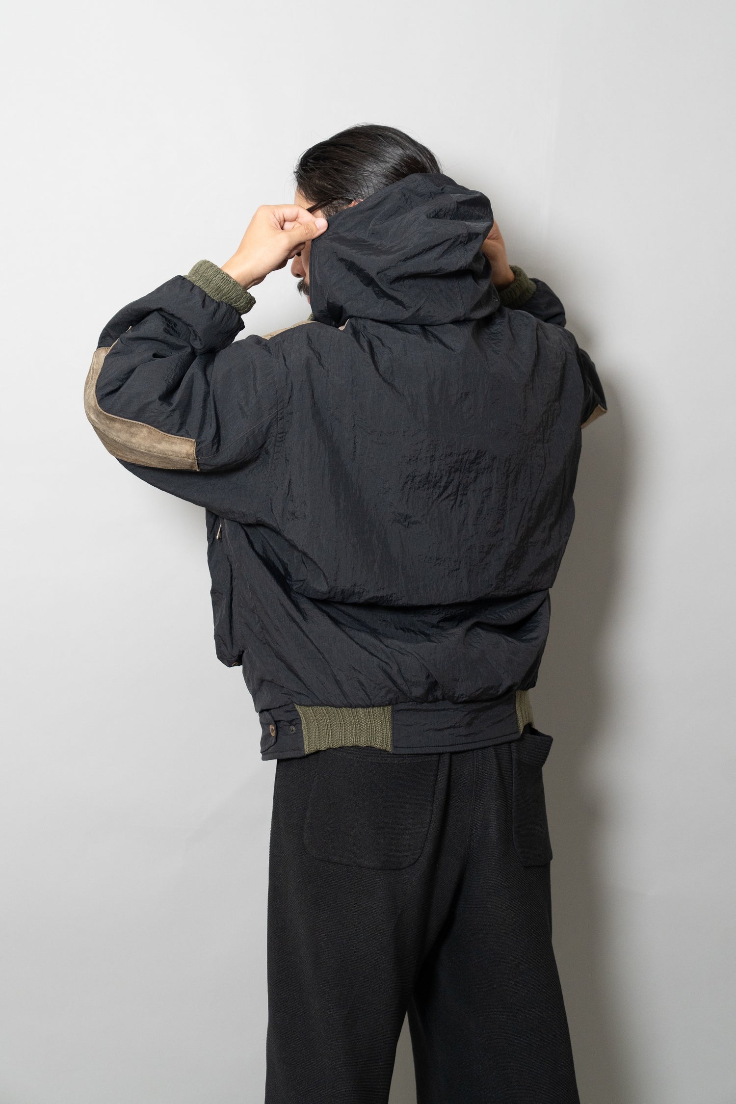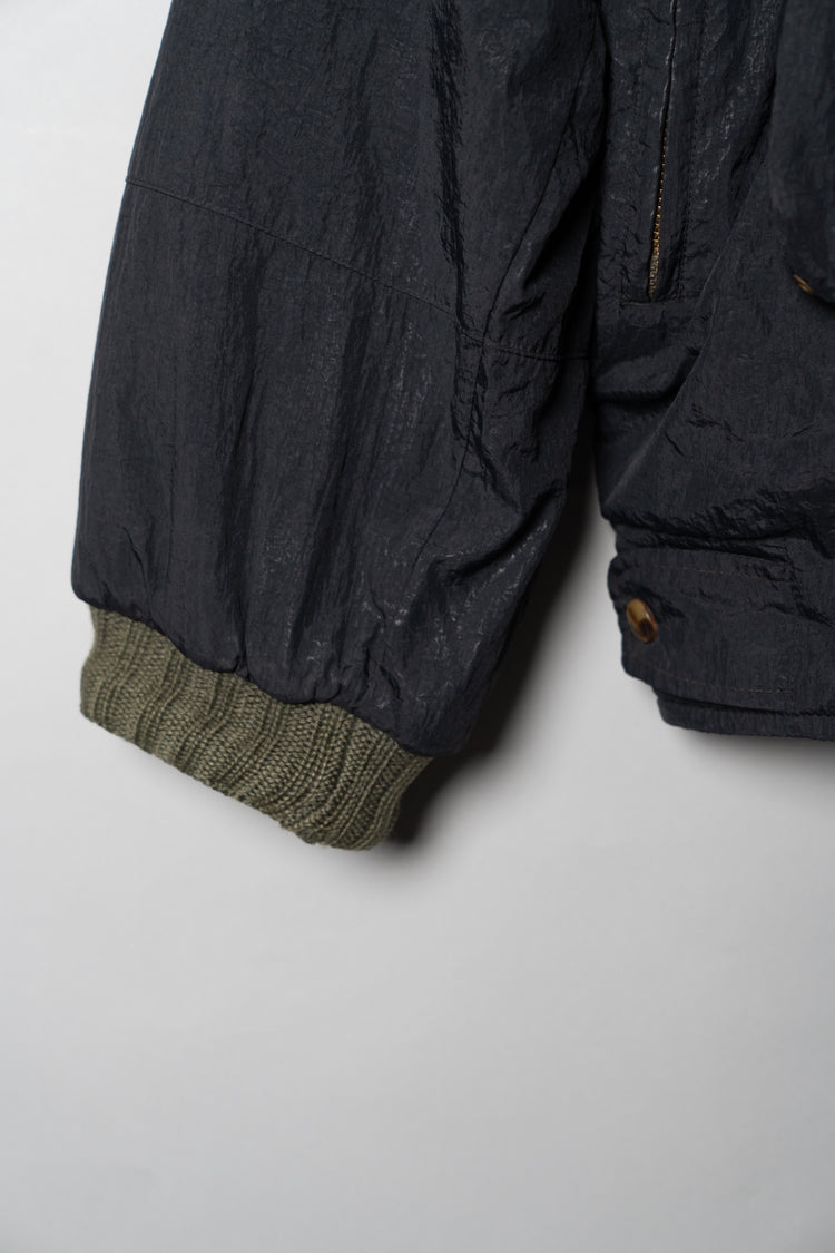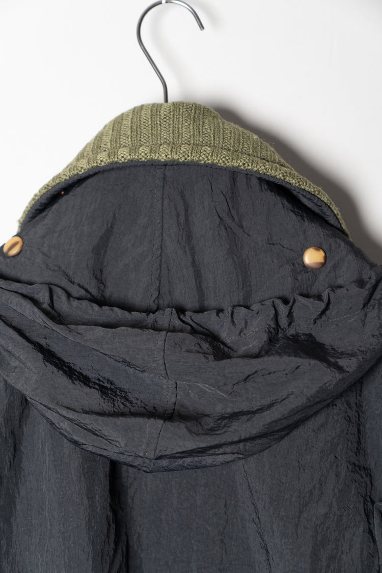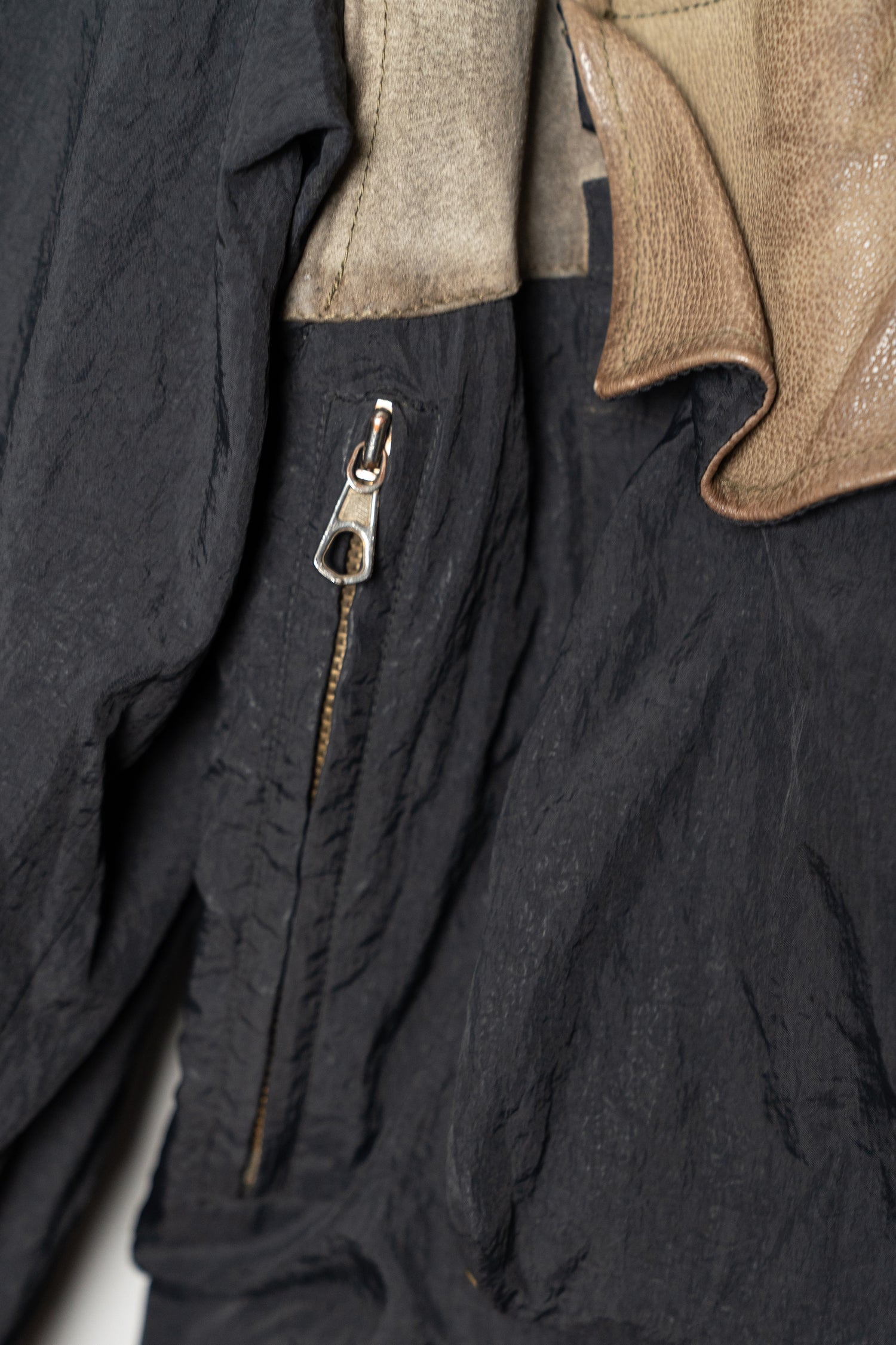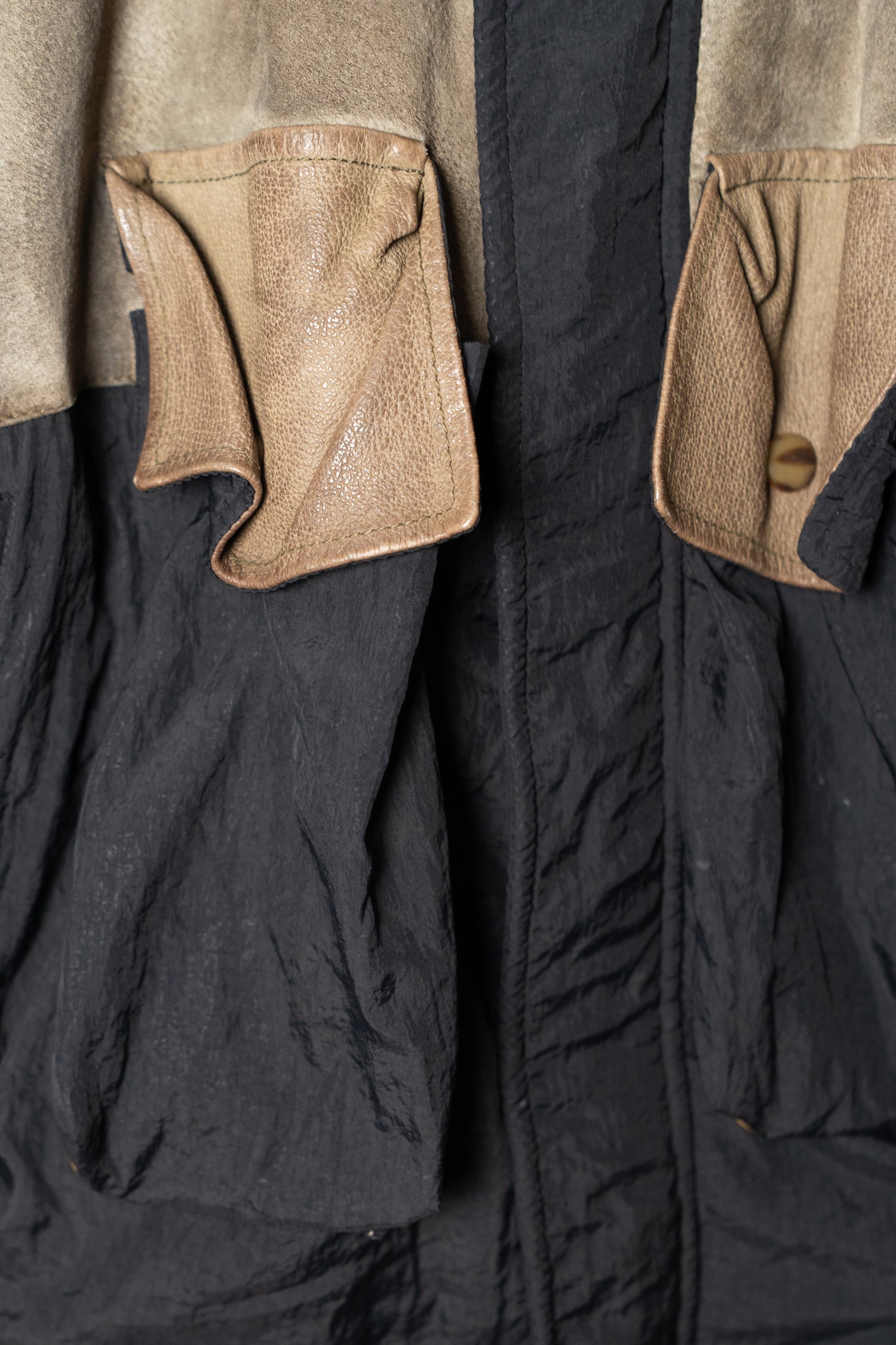 オスティが提唱した「ガーメントダイ(製品染め)」技術も、この時期にはすでにC.P. COMPANYの代名詞となっていましたが、本作は合成繊維であるナイロンと、天然皮革やニットといった異素材を組み合わせた先鋭的な試み。製品染めを行う際、素材ごとの染まり方が異なるため、意図的に生まれる色の濃淡やムラ感が一着ごとに個性を与えます。これにより、まるで一点物のような佇まいを獲得し、量産品でありながら工芸品のような存在感を放ちます。