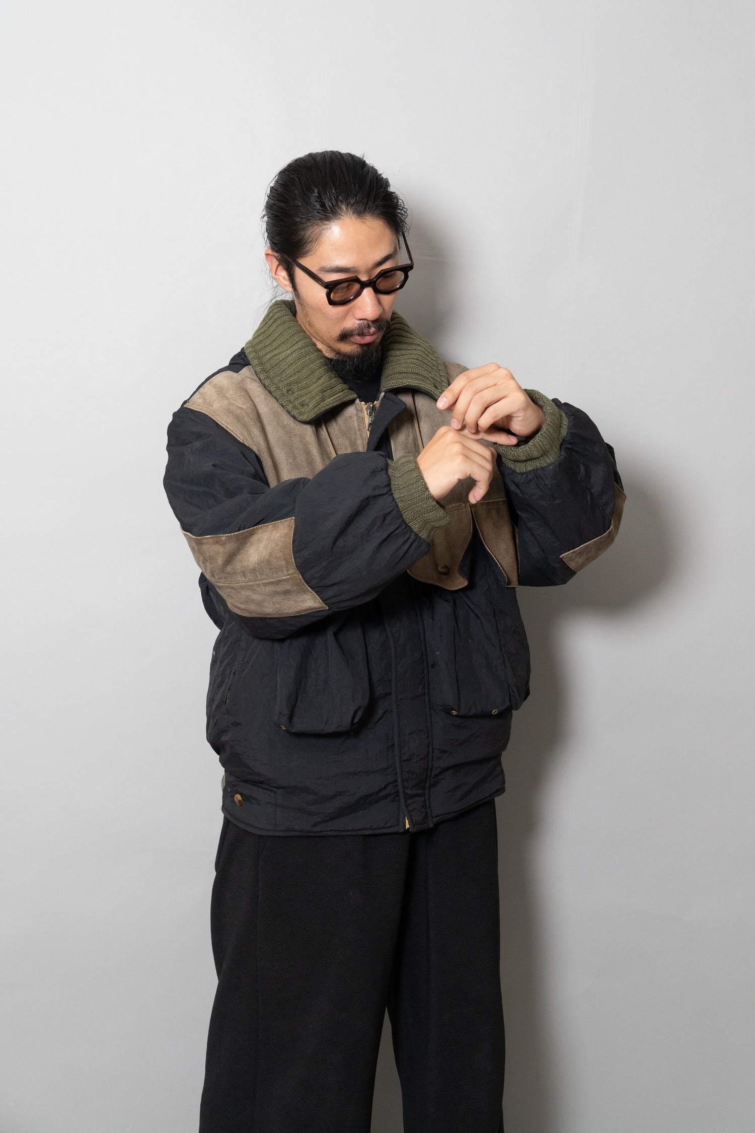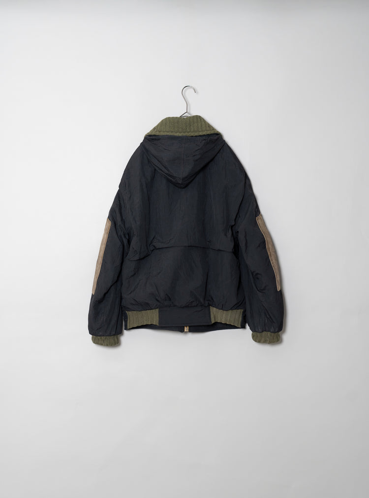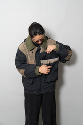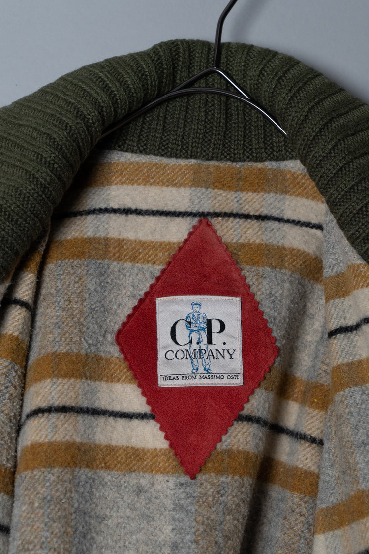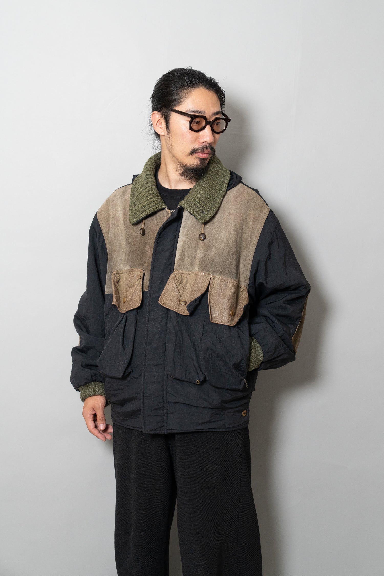 オスティが提唱した「ガーメントダイ(製品染め)」技術も、この時期にはすでにC.P. COMPANYの代名詞となっていましたが、本作は合成繊維であるナイロンと、天然皮革やニットといった異素材を組み合わせた先鋭的な試み。製品染めを行う際、素材ごとの染まり方が異なるため、意図的に生まれる色の濃淡やムラ感が一着ごとに個性を与えます。これにより、まるで一点物のような佇まいを獲得し、量産品でありながら工芸品のような存在感を放ちます。