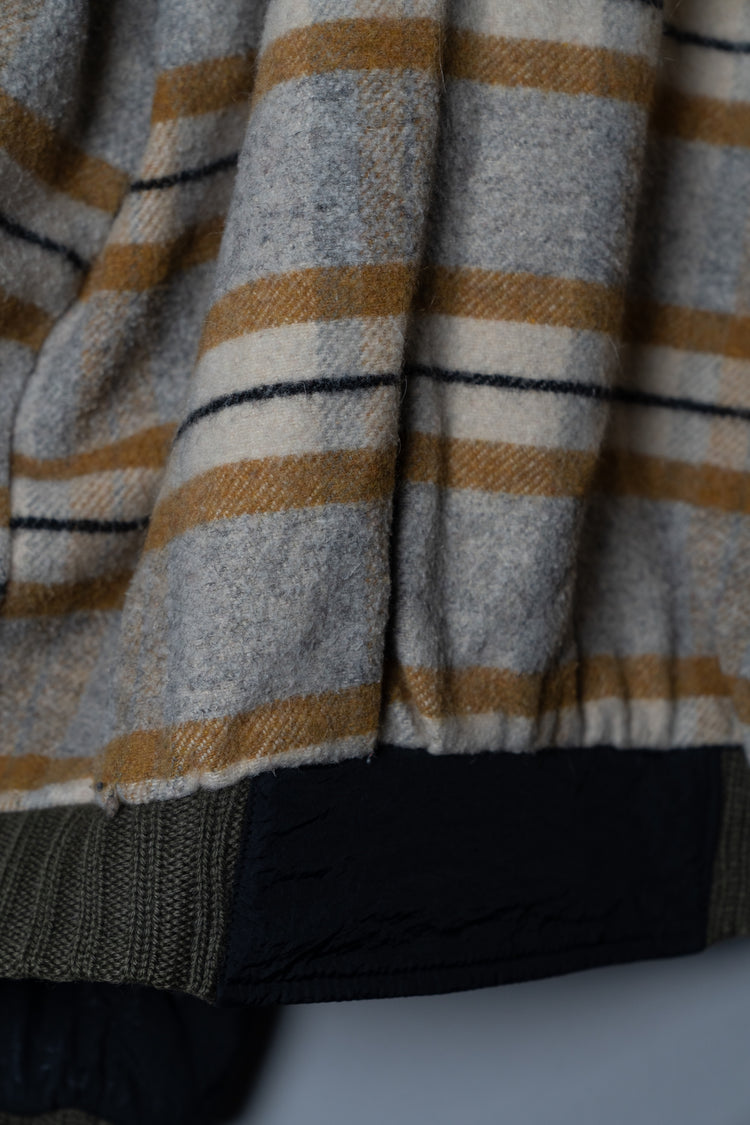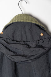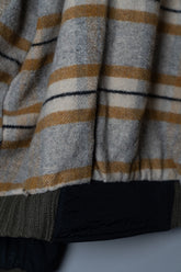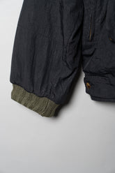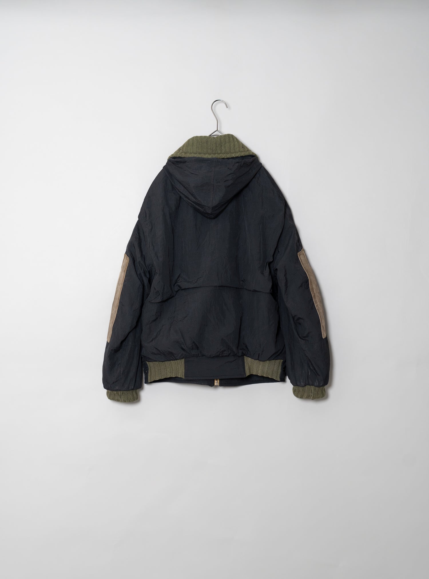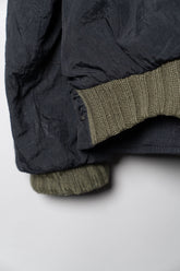 加えて、リブ編みの袖口や襟のディテールも見逃せません。ニットの温かみを取り入れることで、無機質になりがちなナイロン素材に有機的な柔らかさを加えています。内側に配されたストライプライニングは、視覚的な遊び心であると同時に、着脱時にだけ現れる“隠れたデザイン”として所有者に密やかな喜びを与える仕掛けでした。