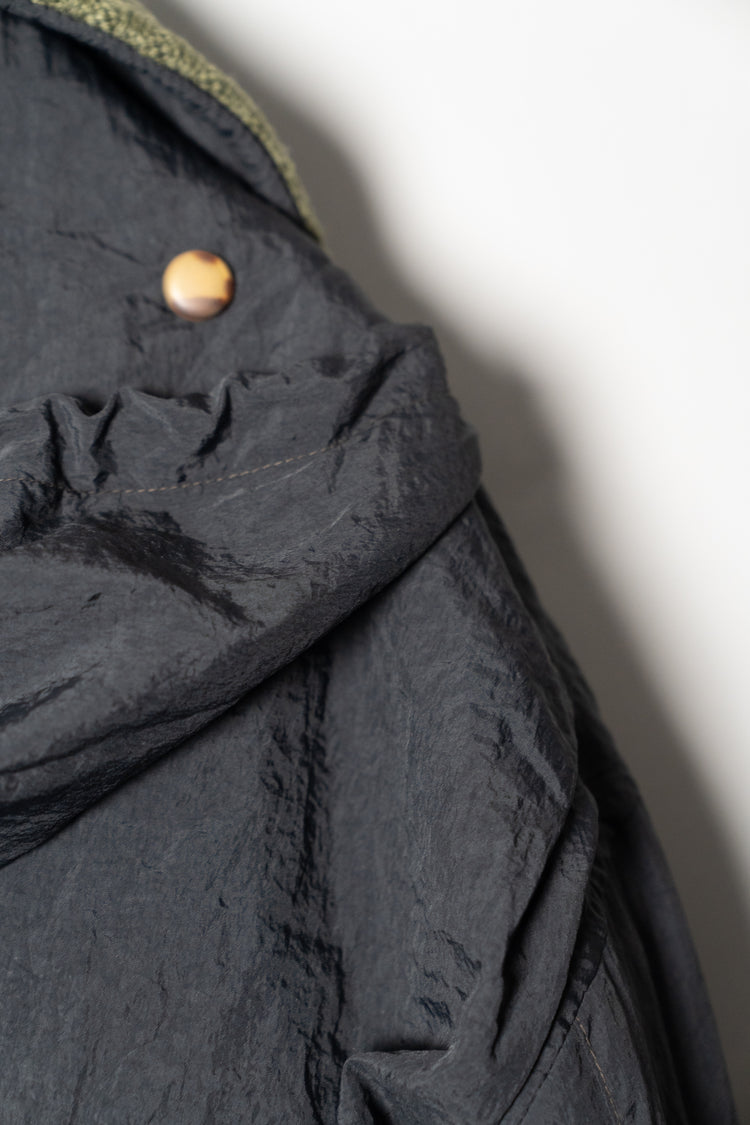 本作「Japanese Nylon Field Jacket」が発表された1983年秋冬は、まさにその代表的なタイミングでした。イタリア国内ではまだナイロンを衣料用素材として積極的に活用する文化が根付いておらず、多くのデザイナーがウールやコットンなど伝統的素材を主軸に据えていた時代。そんな中でオスティは、耐久性と軽量性を兼ね備えた高密度ナイロンに強い関心を示し、素材調達のために目を付けたのが日本の繊維産業でした。