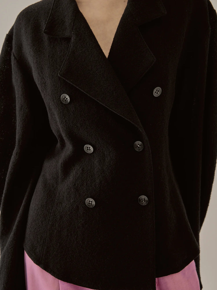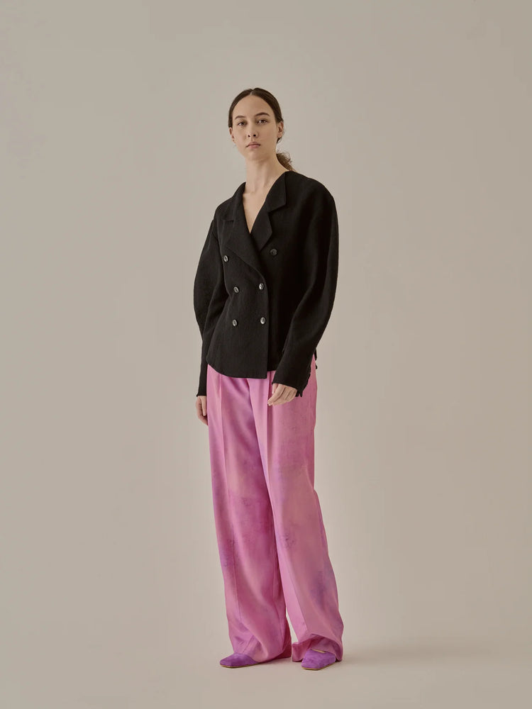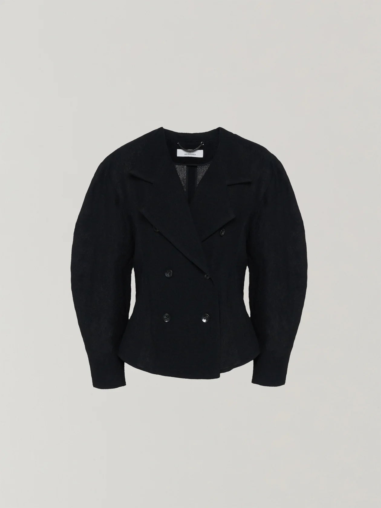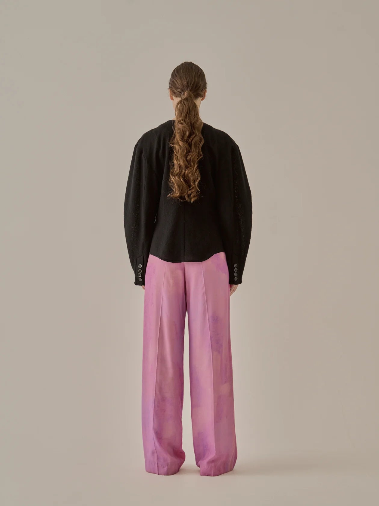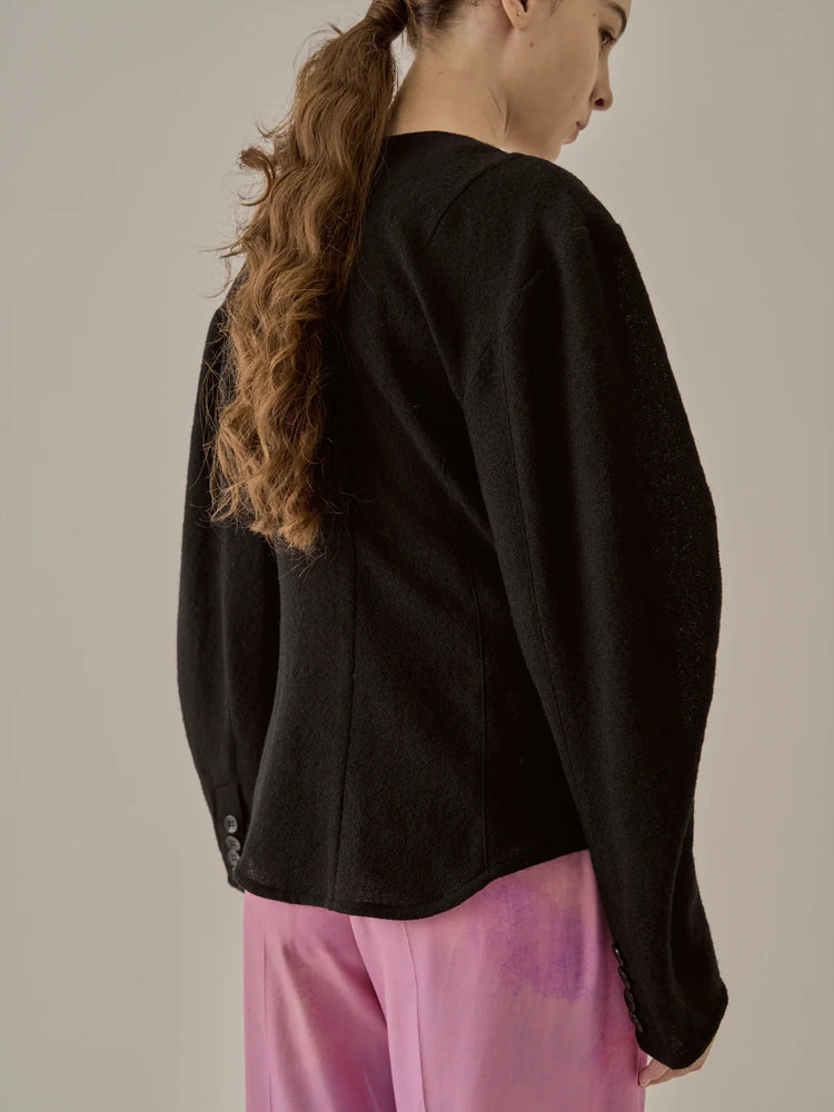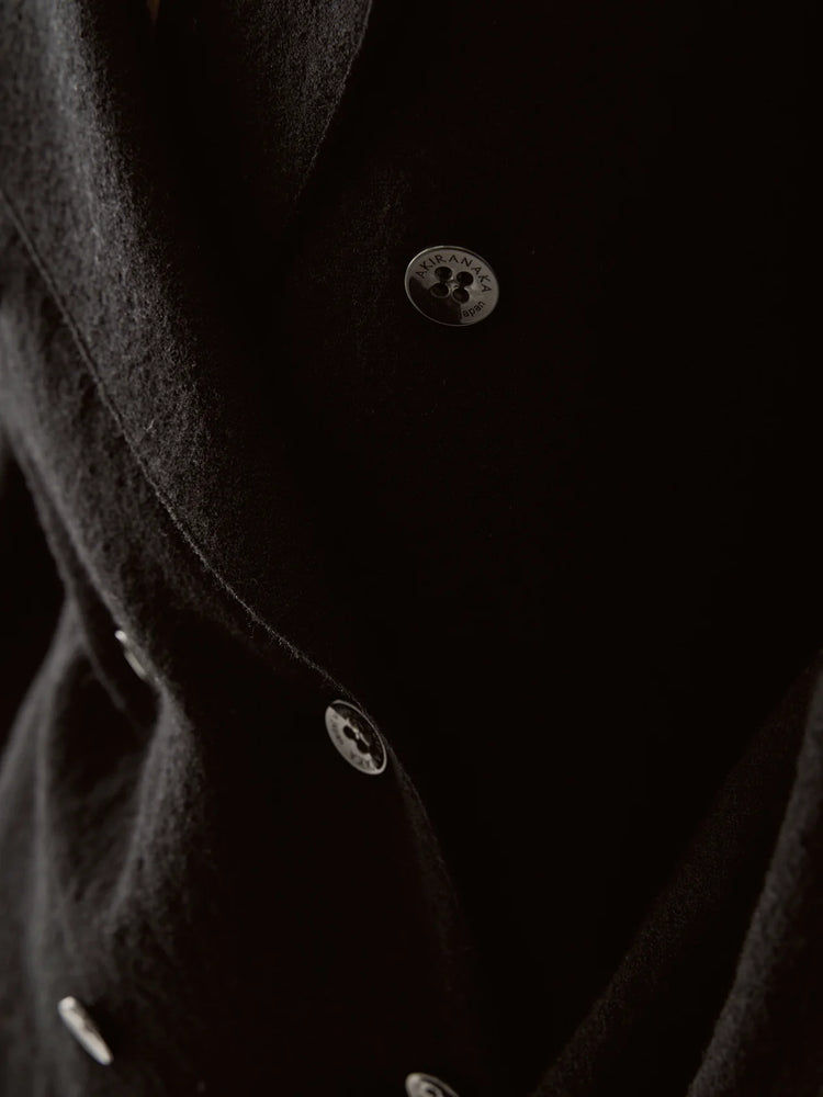 独創的なラぺルのバランスやボリュームを持たせた袖、ラウンドしたヘムのカッティングなど、随所にAKRANAKAらしい個性を宿した一着は、独特なカラーリングとテクスチャーが他にない存在感を放つウールガーゼで仕立てることによりモダンな軽さとリラックスした印象に仕上げています。