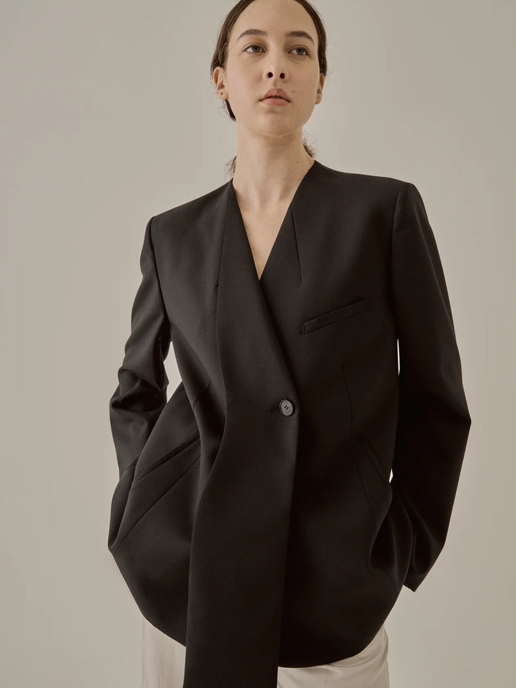 洗練された佇まいに施された独創的なラペルが新しいモダニティへと導くデザインジャケット。