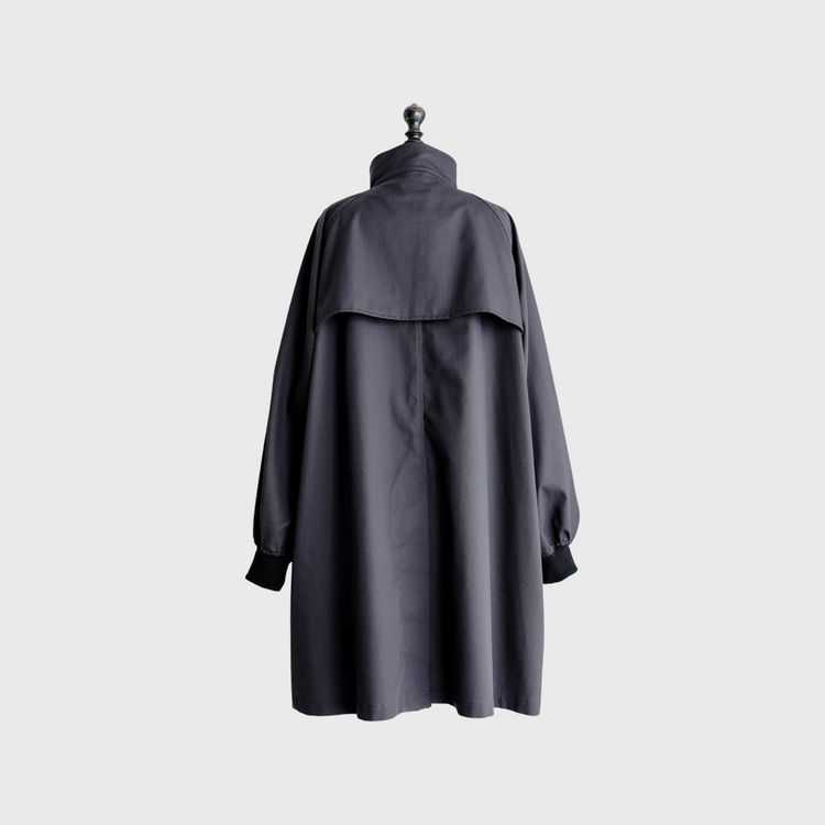コットン/ポリエステルの軽い素材感のロングコートは、襟がスナップボタン式のスタンドカラー。比翼仕立てとなっており、無駄を省いたすっきりとしたフォルムに。袖口はリブになっており、風の侵入を防ぎつつ、デザイン性も◎