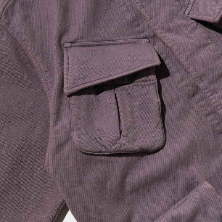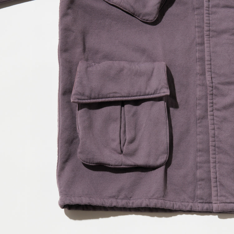 表側がツイル織りで裏側がボア状の起毛になっているダブルフェイスの生地を使用。製品染めで仕上げています。