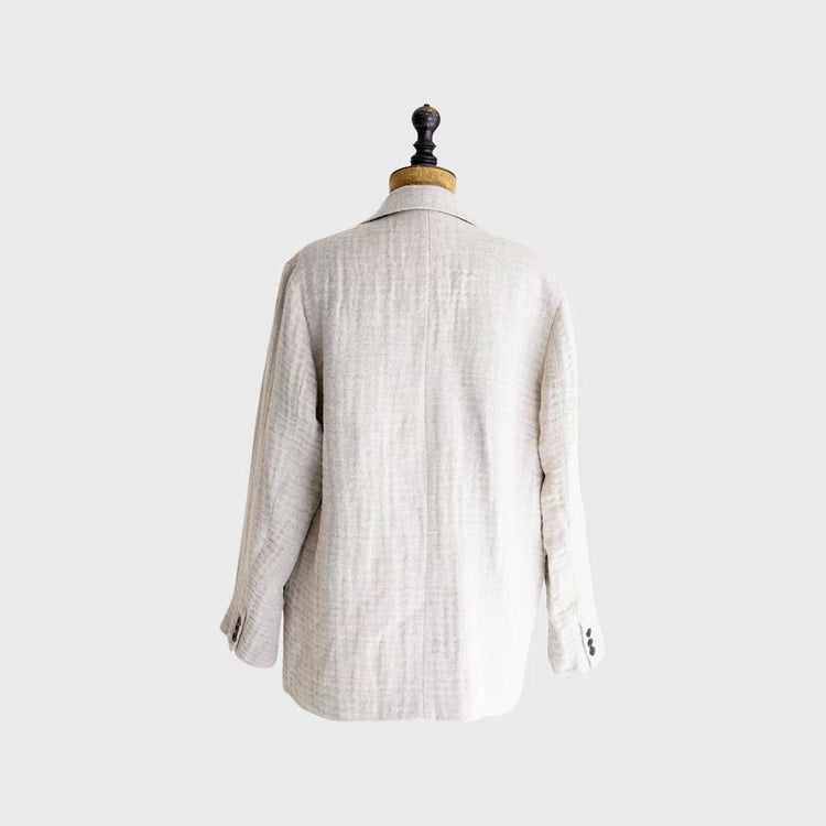 ウールリネンのガーゼ素材を使用したピークドラペルジャケット。上質なウールリネン糸を二重織りで織られた非常に贅沢で、珍しい素材を使用しております。ダブルブレステッドジャケットをコートのようなシルエットでオーバーサイズで表現しており、ゆったりと着用いただけます。刺繍で表現されたフロント、バックのダーツも新鮮です。