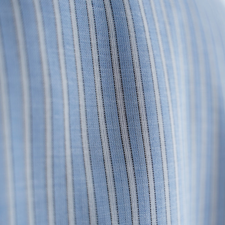 ラミー混のストライプ生地を使用しています。ラミーの鈍い光沢感と、レーヨン特有の落ち感が特徴です。トラディショナルな柄ですが、生地の打ち込みを甘く設定しているのでシアー感があり、風合い、見た目ともに、清涼感のあるとてもバランスの良い生地を使用しています。