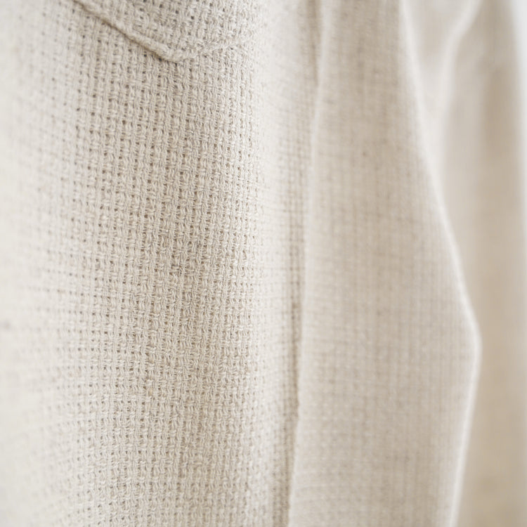 23AWシーズンでもリリースされた、ワイドフレアシルエットのトラウザーになります。今季はレーヨンリネンの混紡糸を使用した、メッシュ素材を使用しています。 非常に軽さがあり、とても珍しい組織(メッシュ)の素材をトラウザー型に落とし込みました。リネン特有の奥行きの有る杢調の色合いが組織にバランス良く溶け込み、他に無い表情を生み出しております。軽い落ち感のある綺麗なシルエットなので、一度着用頂けたらパターンの良さを感じて頂けると思います。