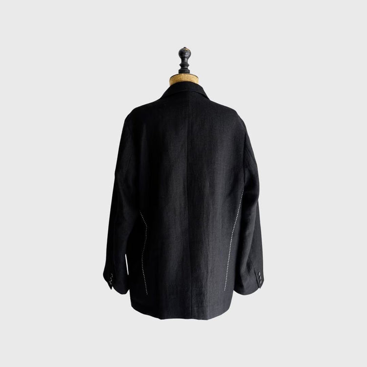 ウールリネンのガーゼ素材を使用したピークドラペルジャケット。上質なウールリネン糸を二重織りで織られた非常に贅沢で、珍しい素材を使用しております。ダブルブレステッドジャケットをコートのようなシルエットでオーバーサイズで表現しており、ゆったりと着用いただけます。刺繍で表現されたフロント、バックのダーツも新鮮です。