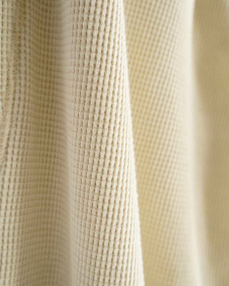 凹凸の大きいビッグワッフル生地を使用したイージーパンツになります。サイドシームをフロントに緩くツイストさせ、すらっと長いレングスが特徴のワイドストレートシルエットになります。