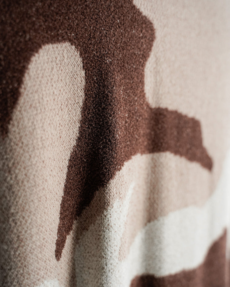 28番手の強燃糸を双糸にした糸をベースに、毛足の長いフェザーヤーンにて柄を表現して製作を進めた本作。強燃糸の張り感とフェザーヤーンの柔らかさが良い塩梅でMIXされ、軽い着心地を生み出しております。