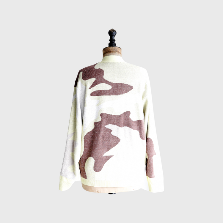 28番手の強燃糸を双糸にした糸をベースに、毛足の長いフェザーヤーンにて柄を表現して製作を進めた本作。強燃糸の張り感とフェザーヤーンの柔らかさが良い塩梅でMIXされ、軽い着心地を生み出しております。