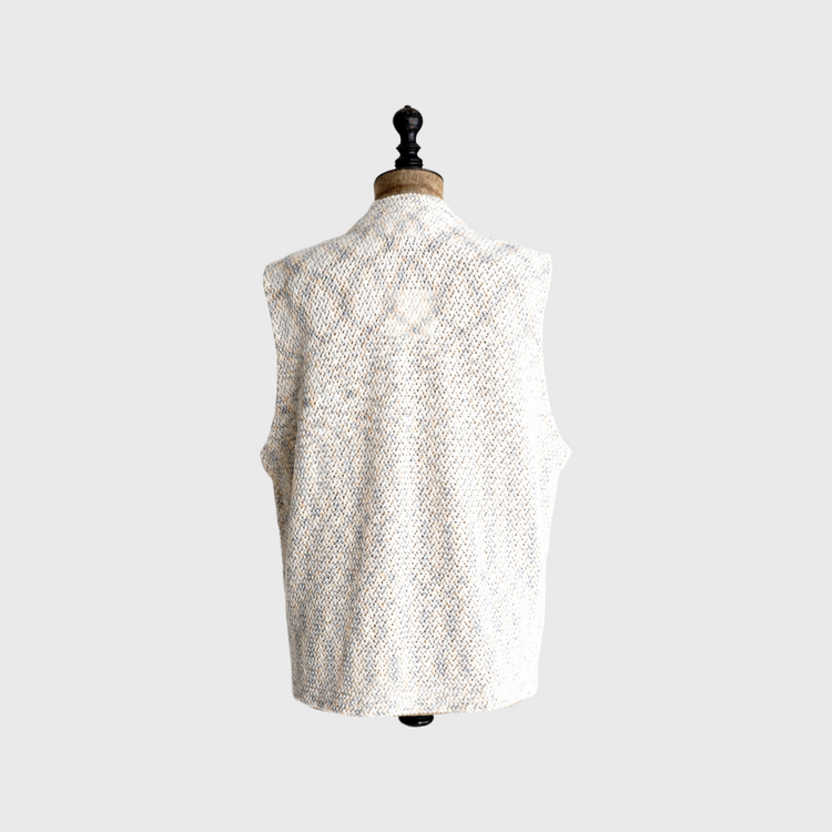 ダレ易い透かし編みのデメリットを毛足の有るカールヤーン糸を引き揃える事で解消。和装をイメージさせる前立てデザインも特徴的なアイテムに仕上がっています。ジャケットの様な羽織物感覚で、着用頂ける雰囲気となっております。