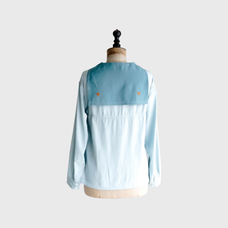 滑らかで軽い肌触りのセーラーシャツ。膨らみのあるカンヌキと星柄の刺繍は職人によるハンド刺繍。ニットやカットソーとのレイヤードスタイルもおすすめの一枚です。