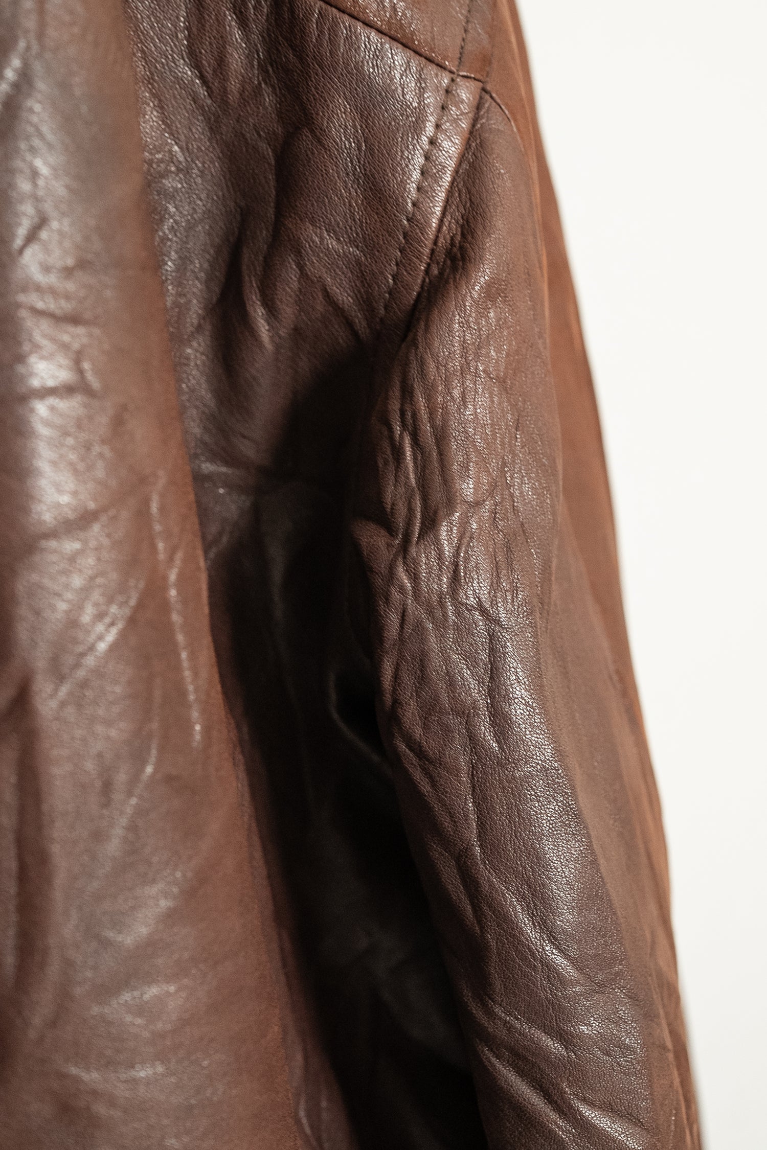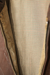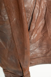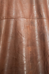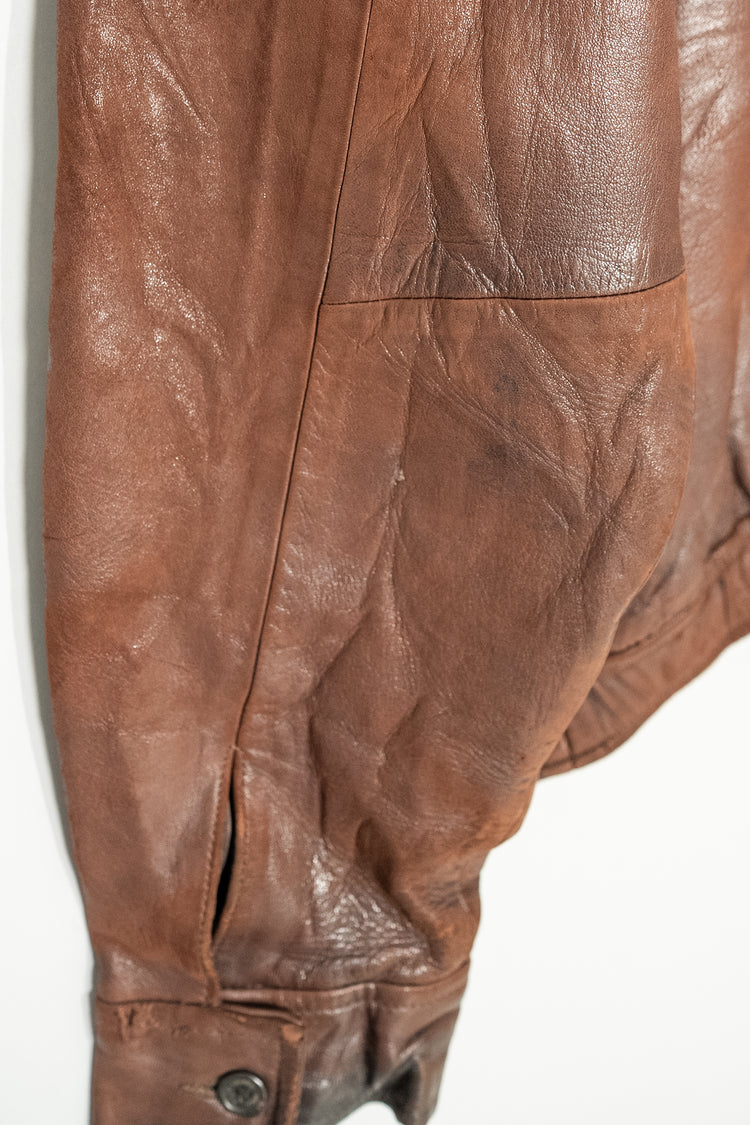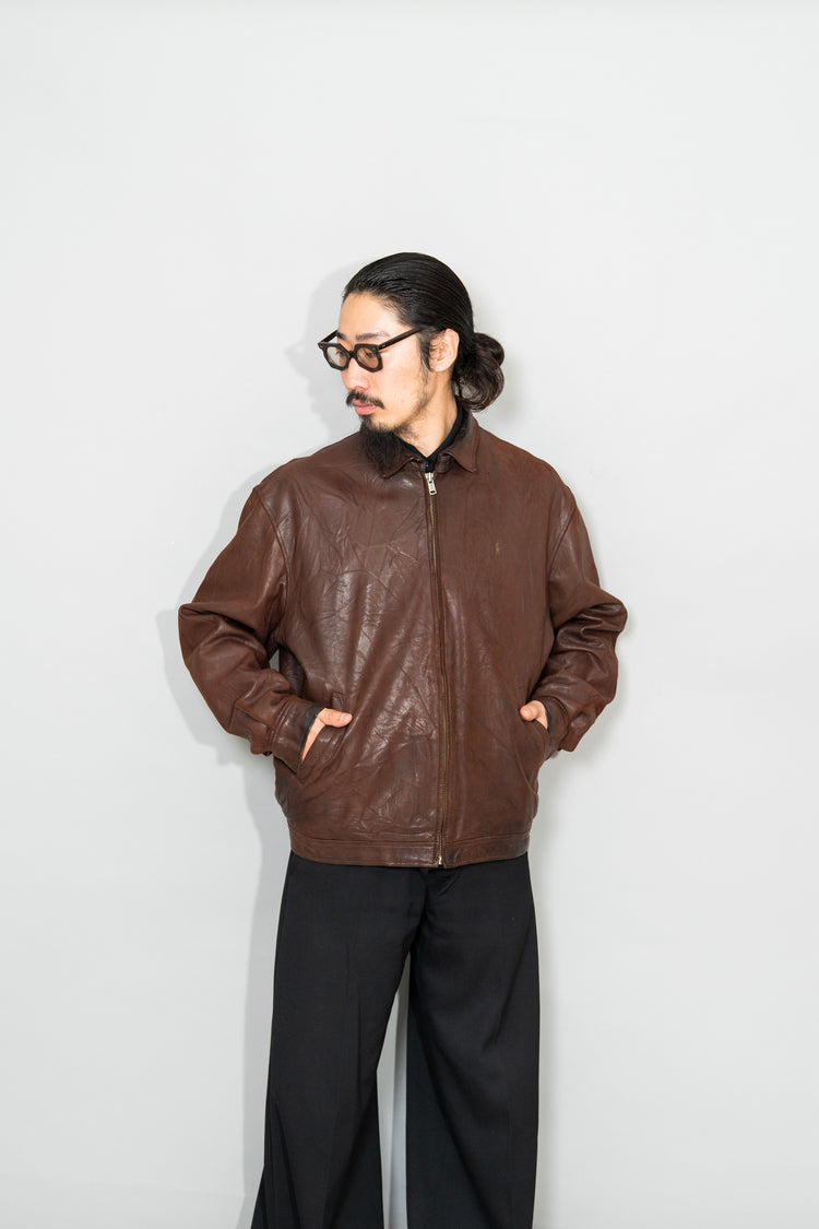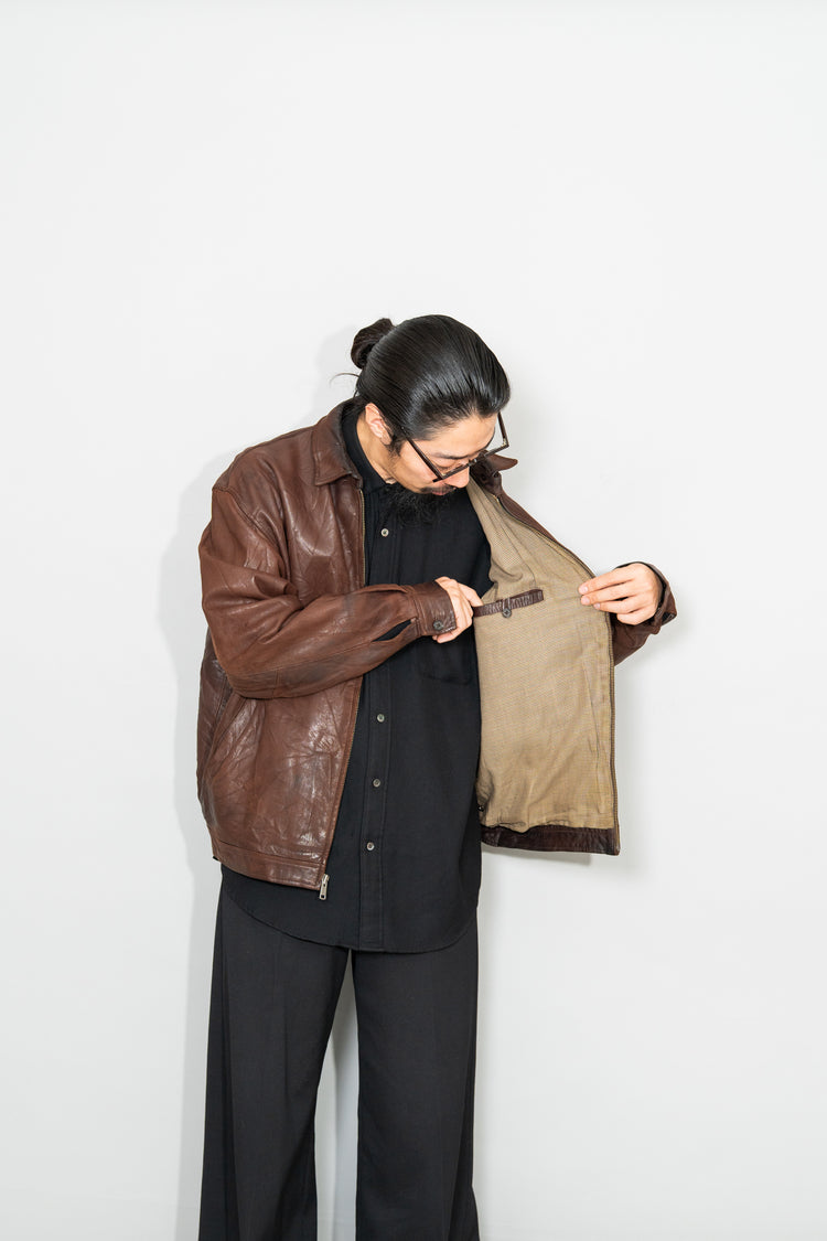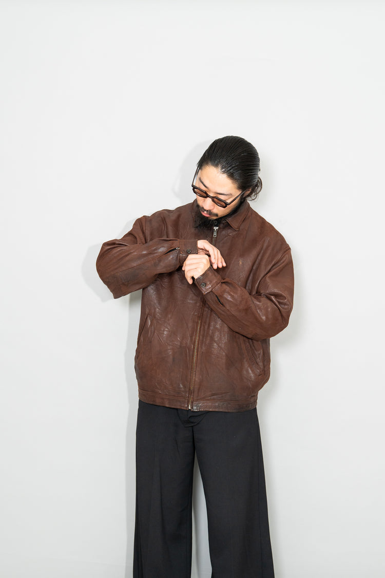 カラーは落ち着きある 深いブラウン。別ページにてご紹介しているXLサイズ個体が、褪色によって明るいブラウンへと変化した味わいを楽しむ一本だったのに対し、このLサイズは当時の色合いを濃密に残し、より男らしく力強い印象。レザー本来の質感を存分に堪能でき、経年がこの先も期待できる一着です。