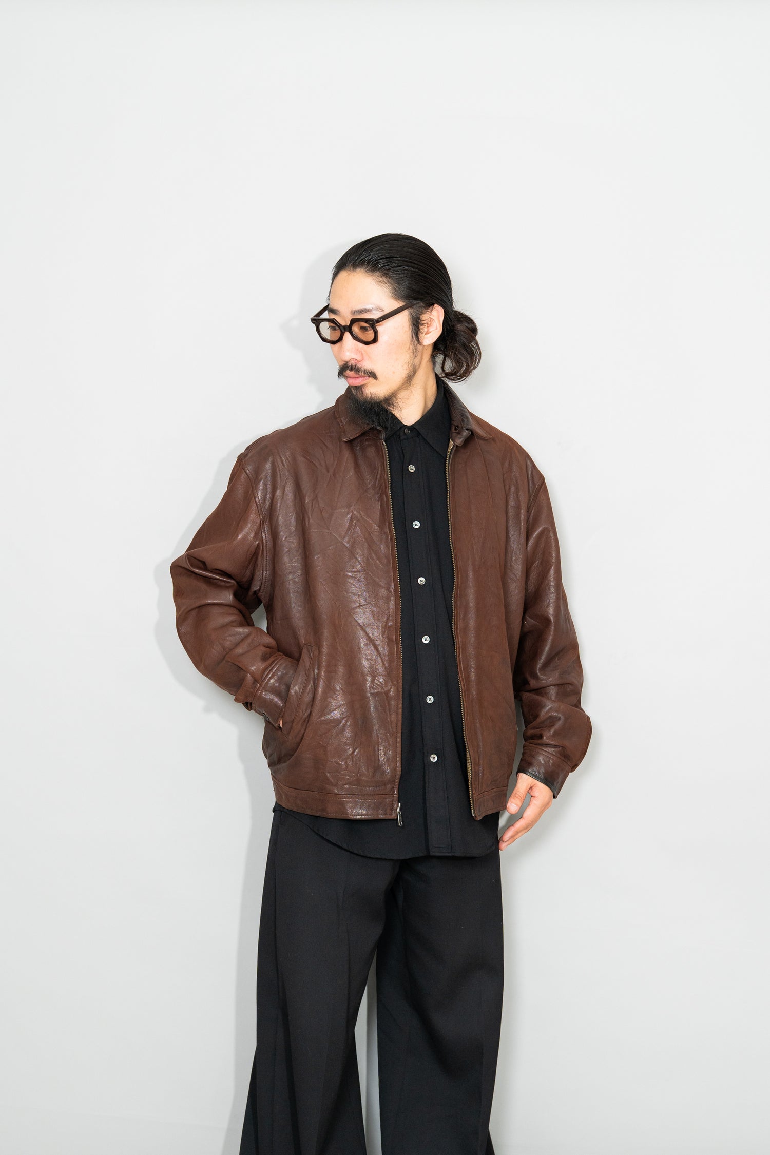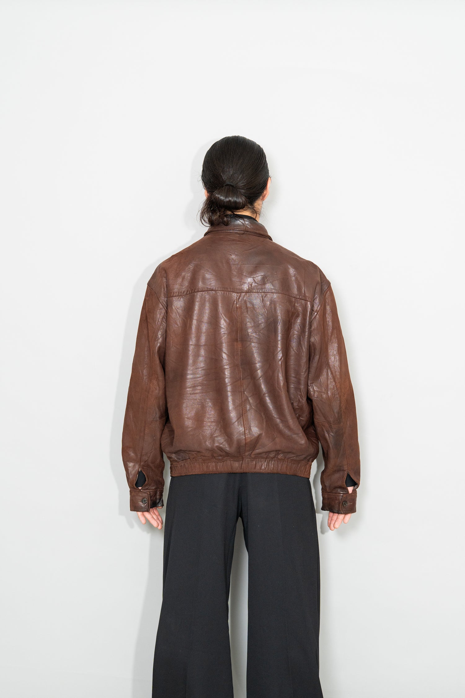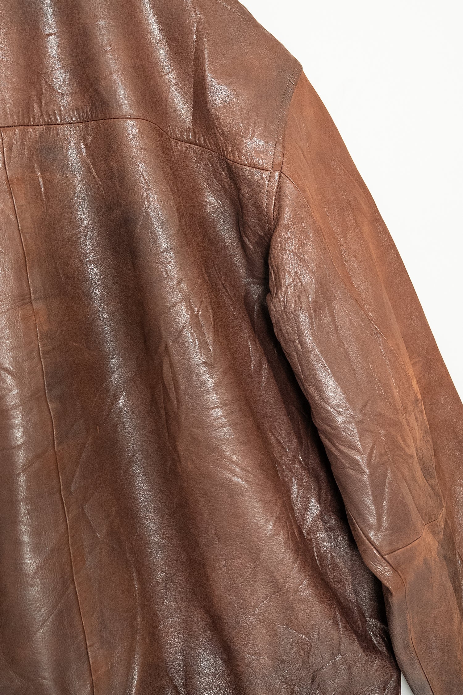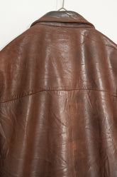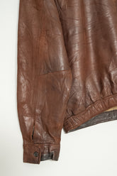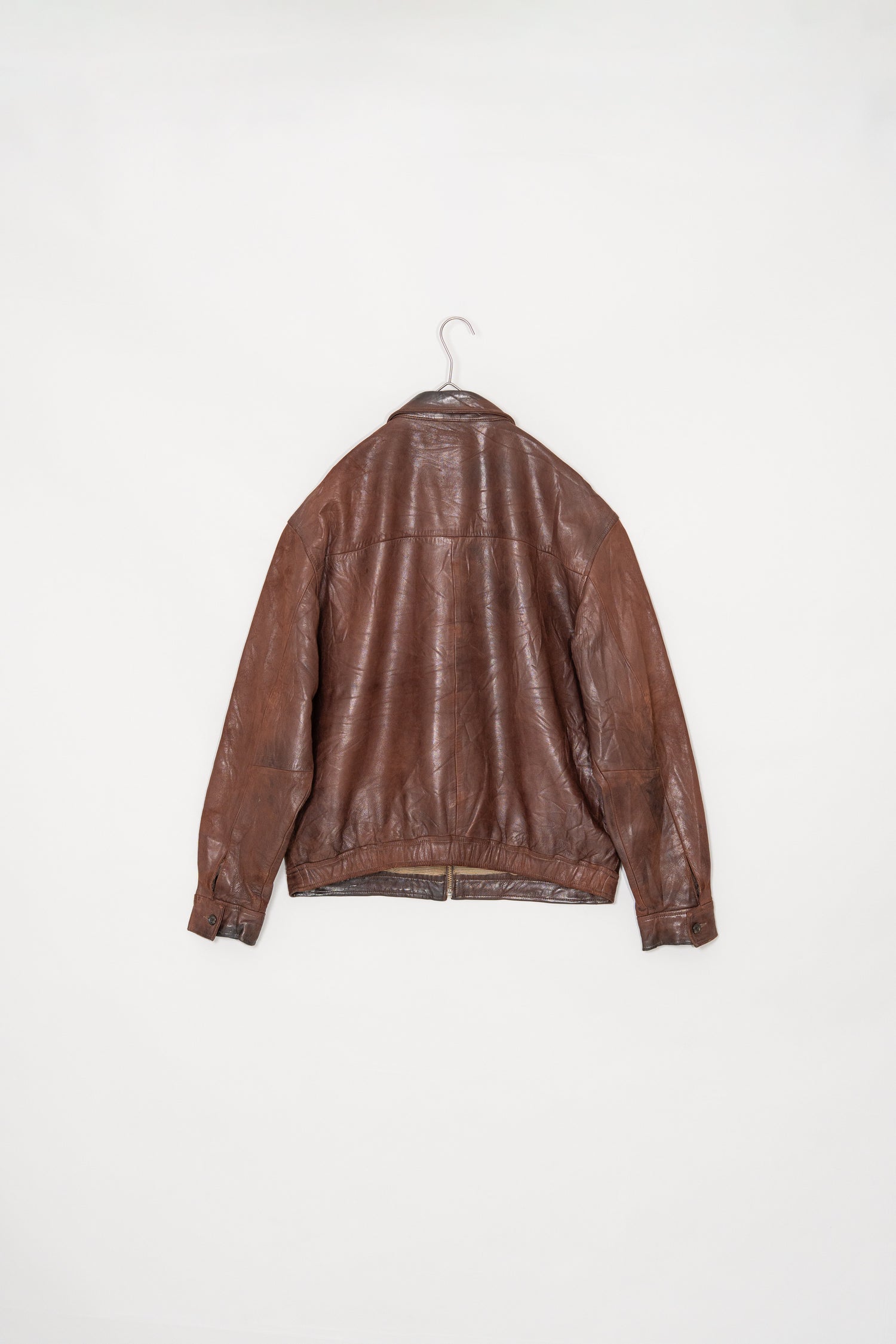 カラーは落ち着きある 深いブラウン。別ページにてご紹介しているXLサイズ個体が、褪色によって明るいブラウンへと変化した味わいを楽しむ一本だったのに対し、このLサイズは当時の色合いを濃密に残し、より男らしく力強い印象。レザー本来の質感を存分に堪能でき、経年がこの先も期待できる一着です。
