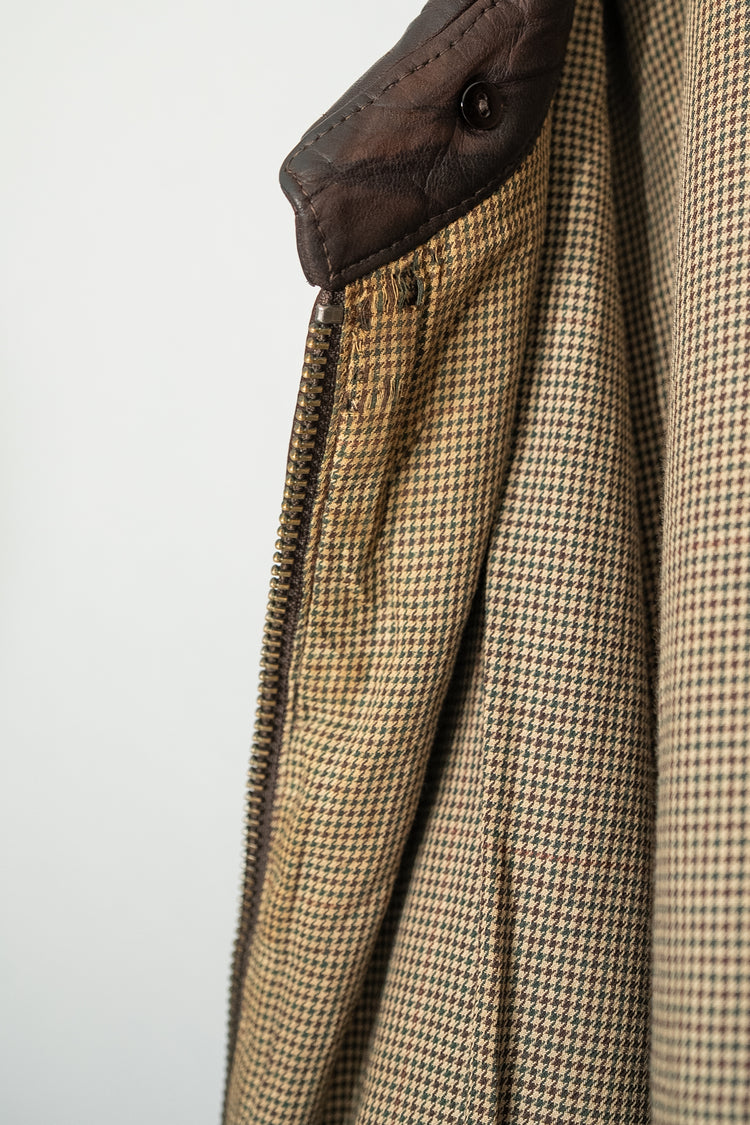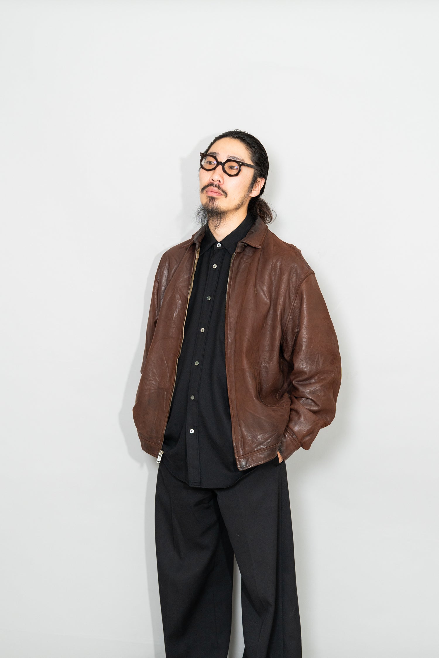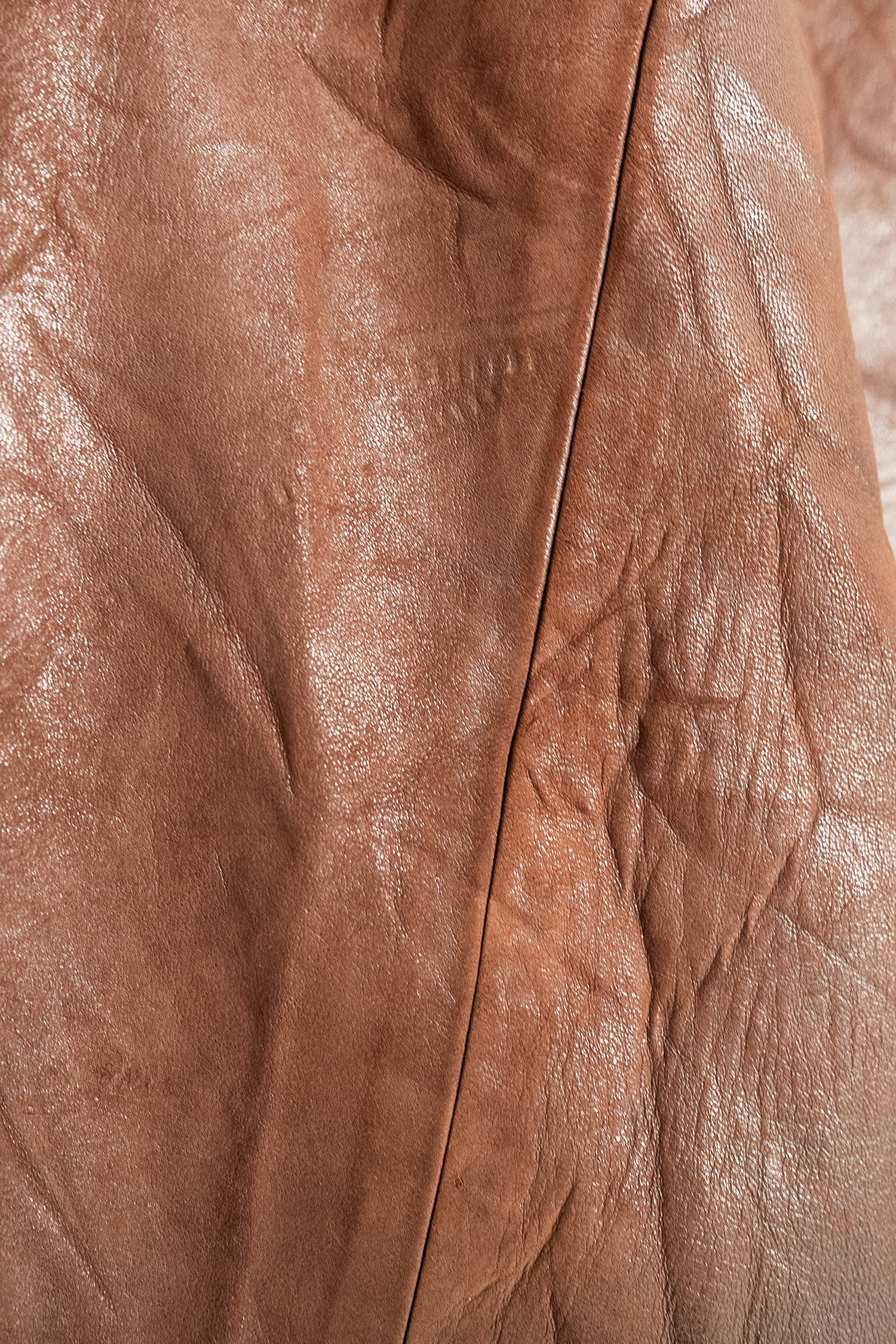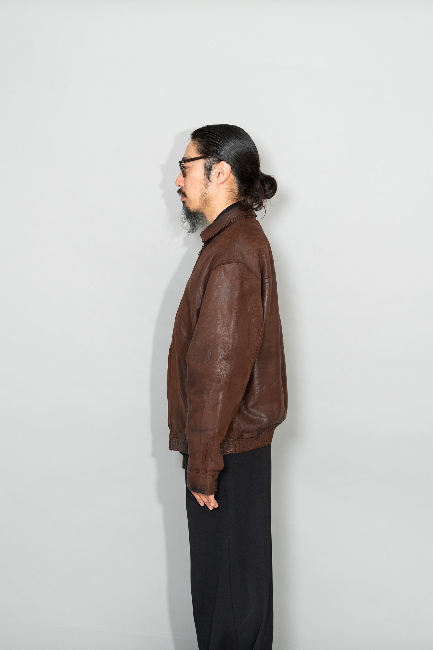 カラーは落ち着きある 深いブラウン。別ページにてご紹介しているXLサイズ個体が、褪色によって明るいブラウンへと変化した味わいを楽しむ一本だったのに対し、このLサイズは当時の色合いを濃密に残し、より男らしく力強い印象。レザー本来の質感を存分に堪能でき、経年がこの先も期待できる一着です。