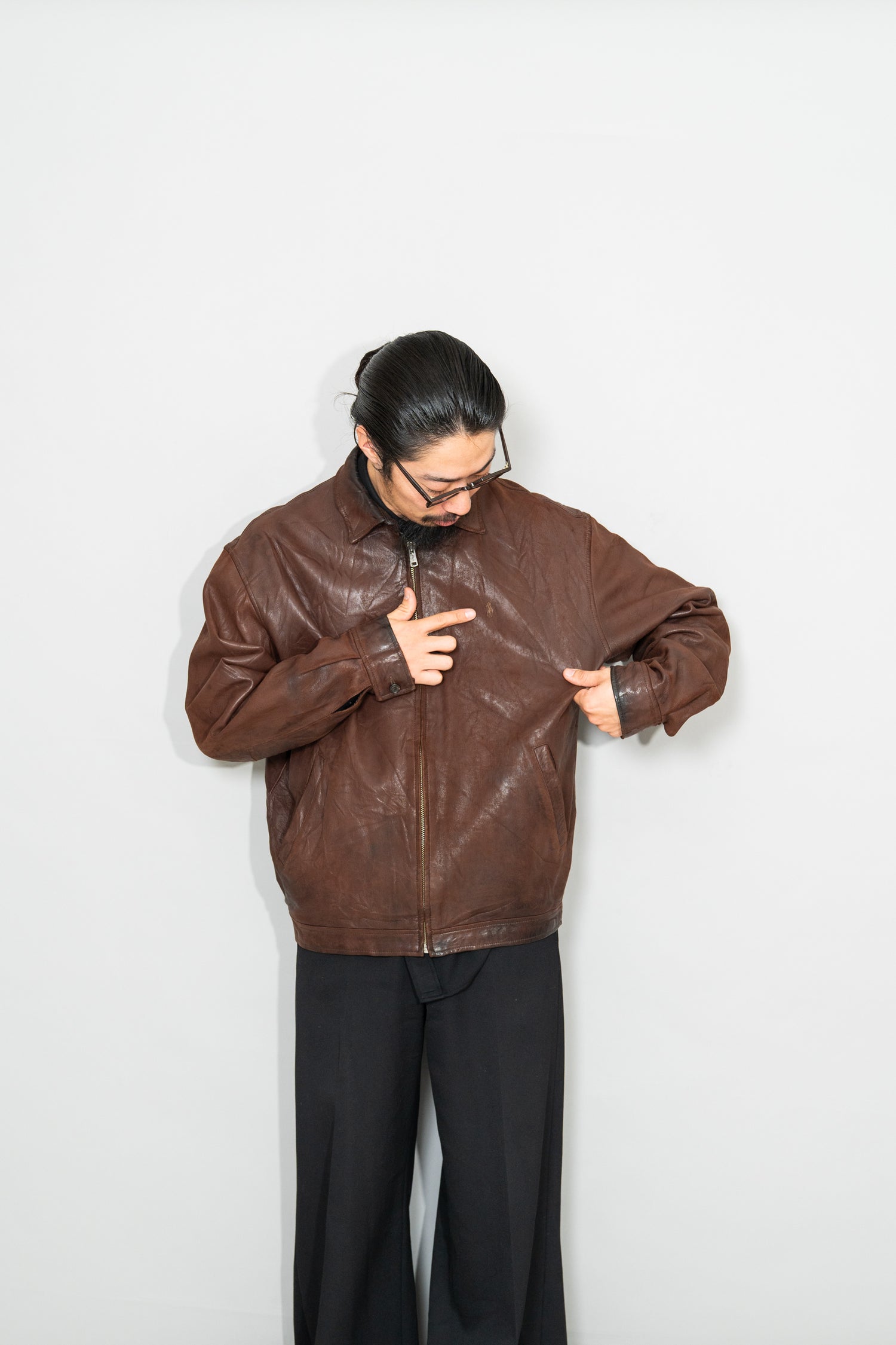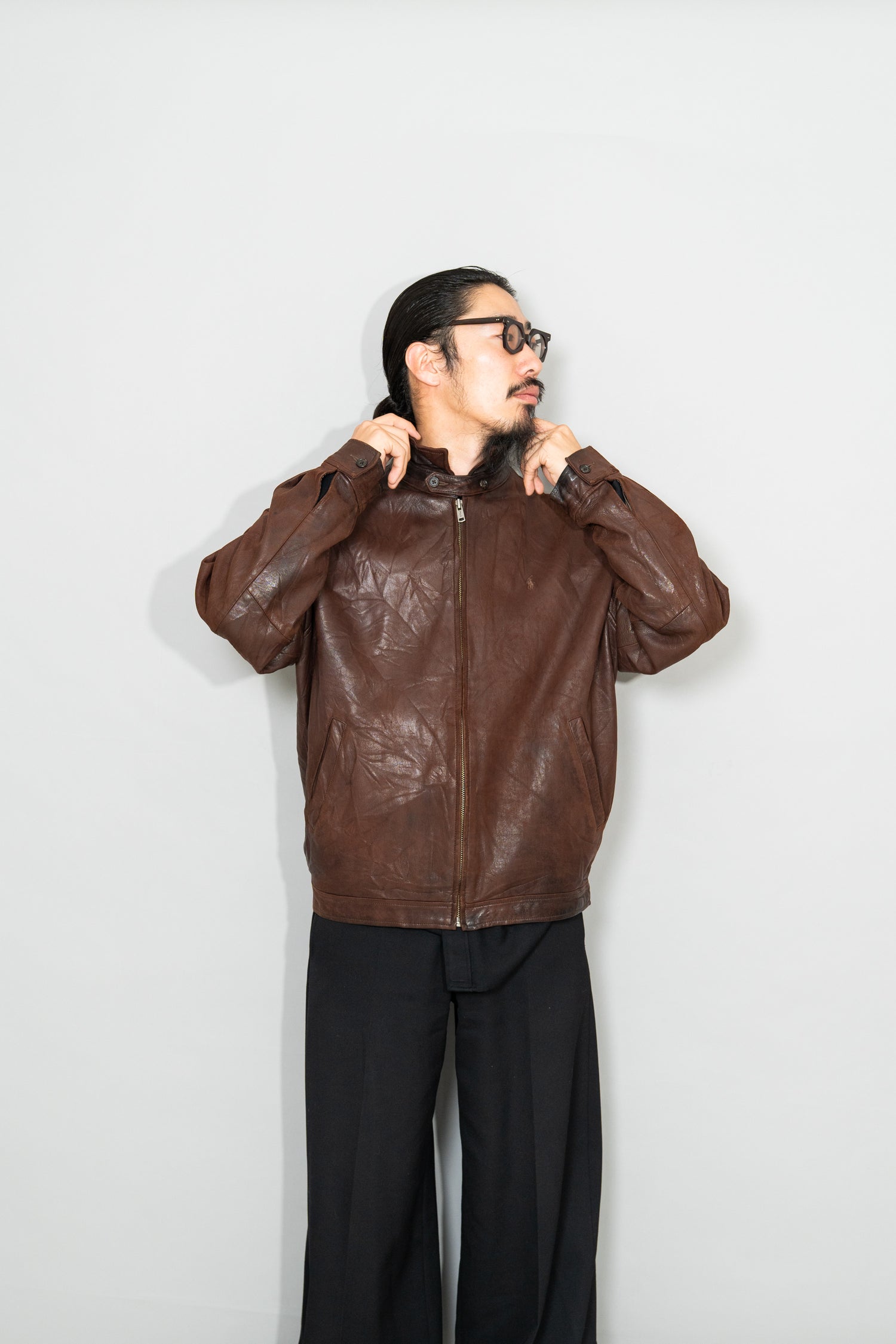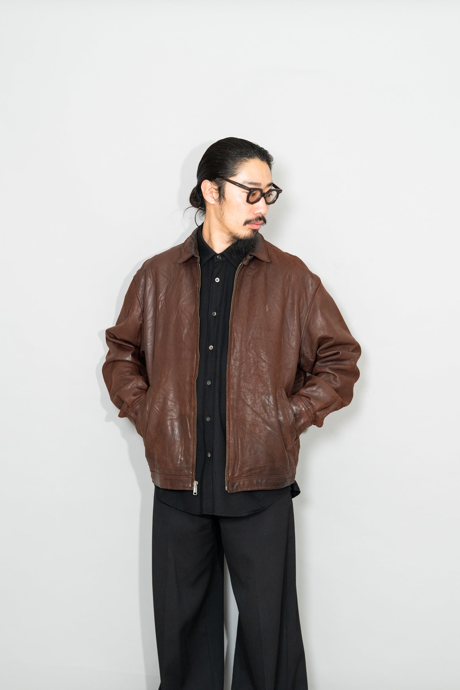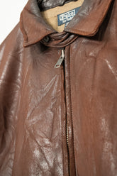 中でもこちらの ラムレザーシングルジャケットは、90sラルフローレン黄金期を象徴する名作。柔らかいラムならではの肌に吸い付くような馴染みと、年月を経て深まり続ける光沢。ミニマルで無骨すぎないデザインは、MA-1やA-2、スポーツジャケットといったアメリカンレザーウェアの流れを汲みながら、都会的で洗練された佇まいに仕上げられています。
