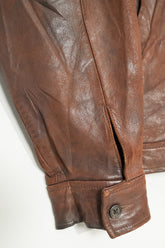 襟元にはチンストラップ付き。カバーオールやレザーフライトジャケット等、機能的ワークウェアのディテールを踏襲しつつ、ドレス感のあるレザーで構築されたこのギャップがまた魅力的。袖はボタンアジャスト仕様。XL個体は左右2ボタンが揃っていましたが、こちらのLサイズは左右1つずつ欠損しています。その分、気負わずガシガシ着られる、良い意味でラフな状態とも言えます。