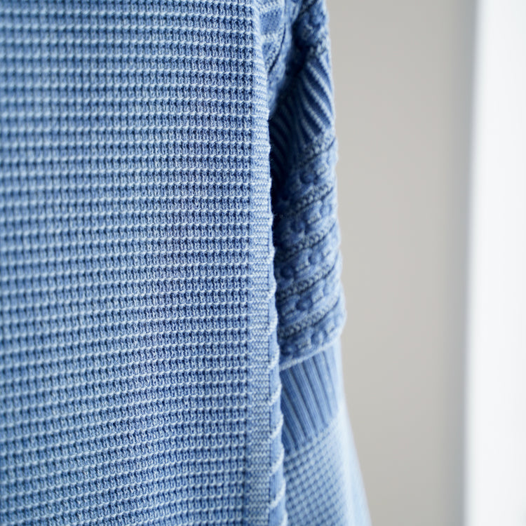 身頃脇の丸みのあるケーブル編みでもこもことしたひつじ雲を、身頃中央と袖のワッフル編みで稲刈りが終わった秋の田んぼを表しております。