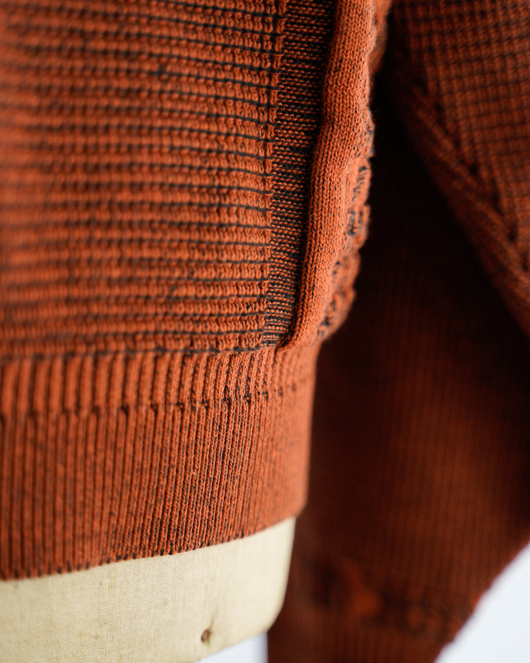 こちらの作品で使用している生地は、10ゲージの編み機に40番手双糸を6本取りして編み立てております。10ゲージの編み機に40番双糸をかけるとなると、通常であれば2本の糸で編み立てるところですので、こちらの生地では3倍の糸を使用していることになります。その分密度が高くなり、軟弱では無く、ギュッと詰まった生地が出来上がります。