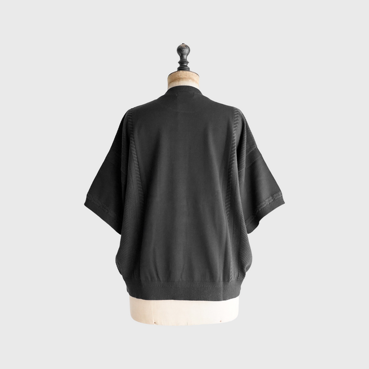 穏やかな青空の下に遠くに見える満開の桜の花が淡い霞の様に見える様子をイメージしたデザイン。身頃中央と袖の天竺編みで青空を、身頃脇の斜線と細かな凹凸の柄で霧がかかった様に見える桜の花を表しております。裏の糸が表の編み目の間からうっすらと見え、奥行きのある表情に仕上がっているのが特徴です。昨年までのものよりも薄く、軽く仕上げているので、夏場も涼しく着用が可能です。大きく肩が落ちて柔らかい印象となるのが特徴な1枚。ゆとりがある形の為、男性はもちろん、女性がオーバーサイズに着るのも魅力的なシルエットです。