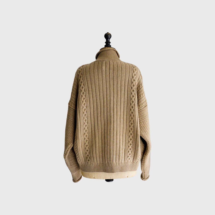 暖かな部屋で窓に水滴が付いた様子をイメージしたデザイン。身頃の縦に入った様々な柄で窓に付いた大きさの異なる水滴や、太くなったり合流したりと自由に流れる雫を表しております。カールした襟と袖口が目を惹きます。一枚で着用するだけでコーディネートが成り立つ程の存在感がありますが、インナーとしても程良く主張する一着となっております。