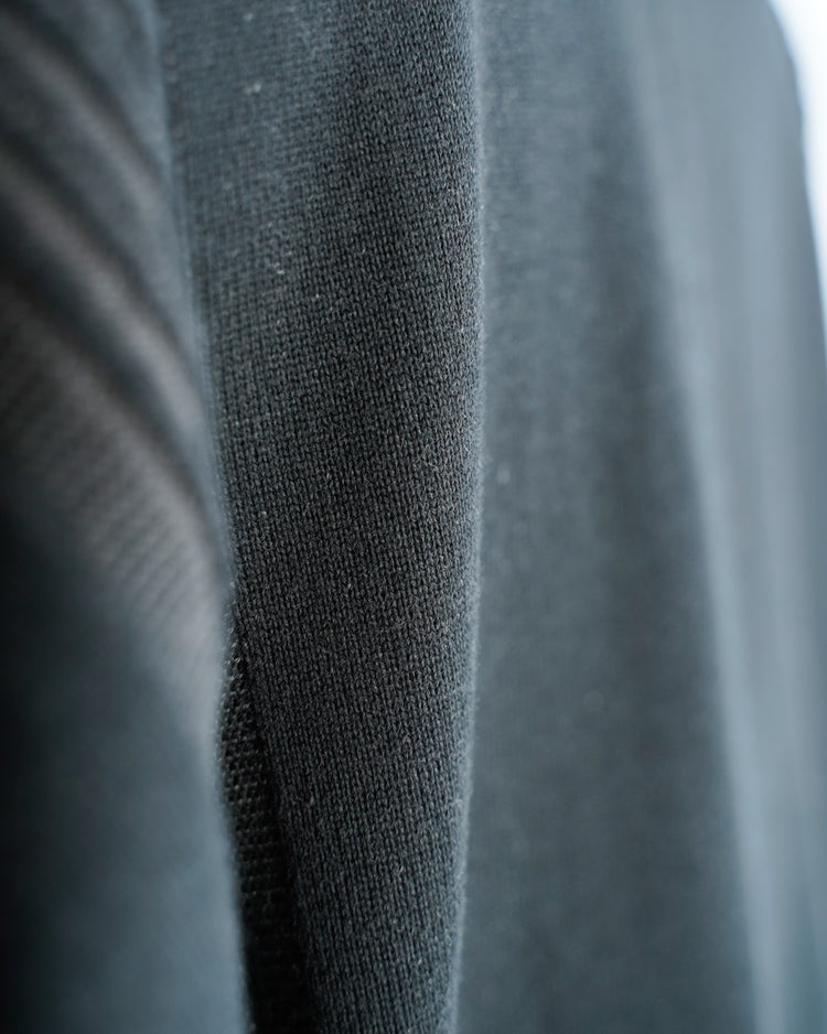 こちらの作品では、40番手の綿糸を二本撚り合わせ、その糸を三本取り12ゲージの編み機に掛けて編み立てております。通常の二倍近くの本数を使用しておりますので、しっかりと目が詰まった編み地です。