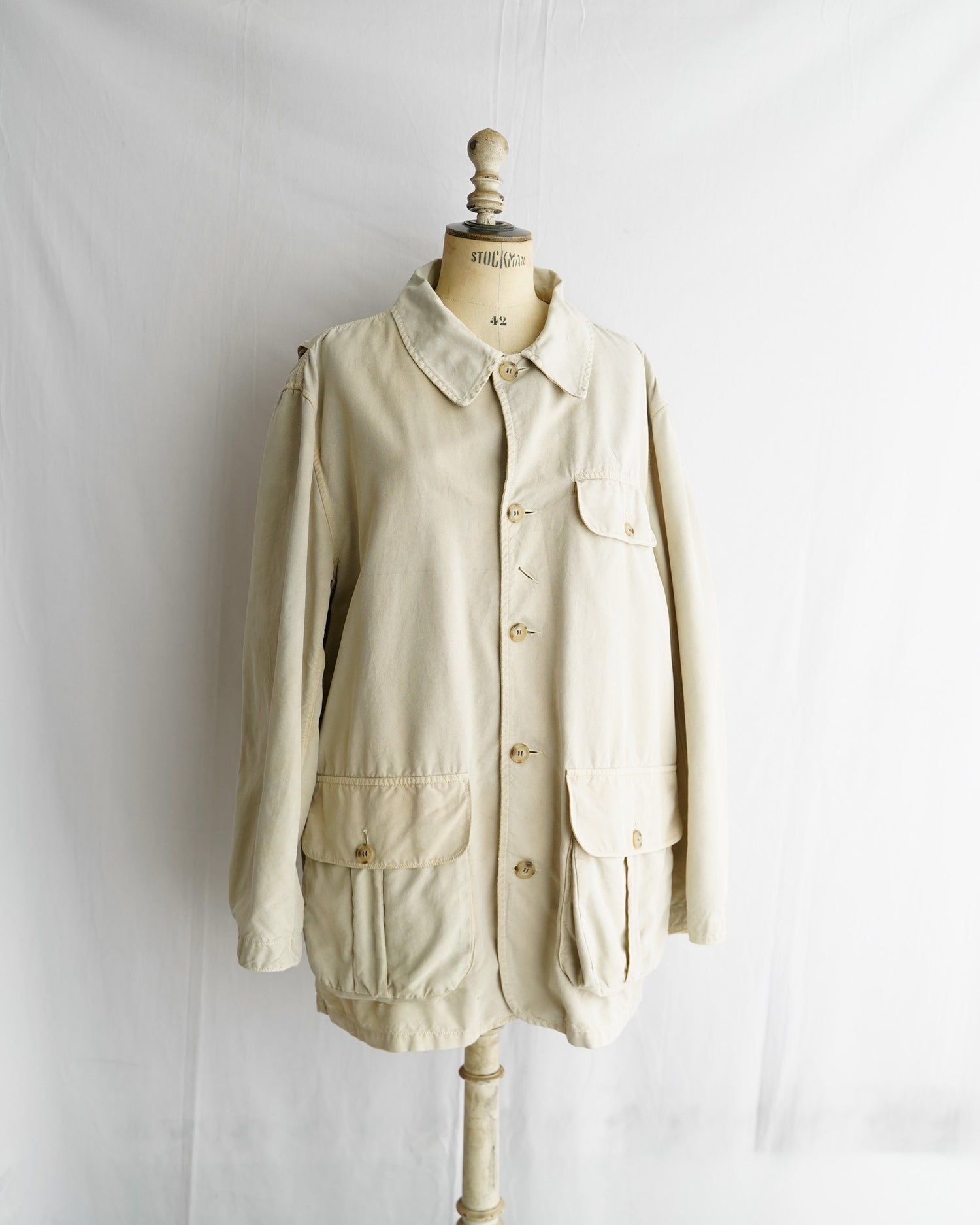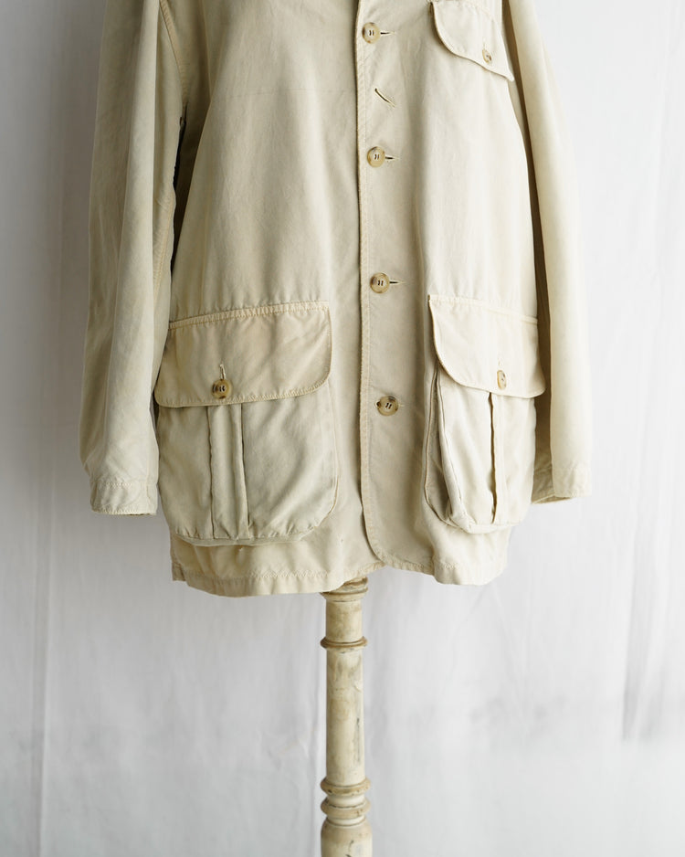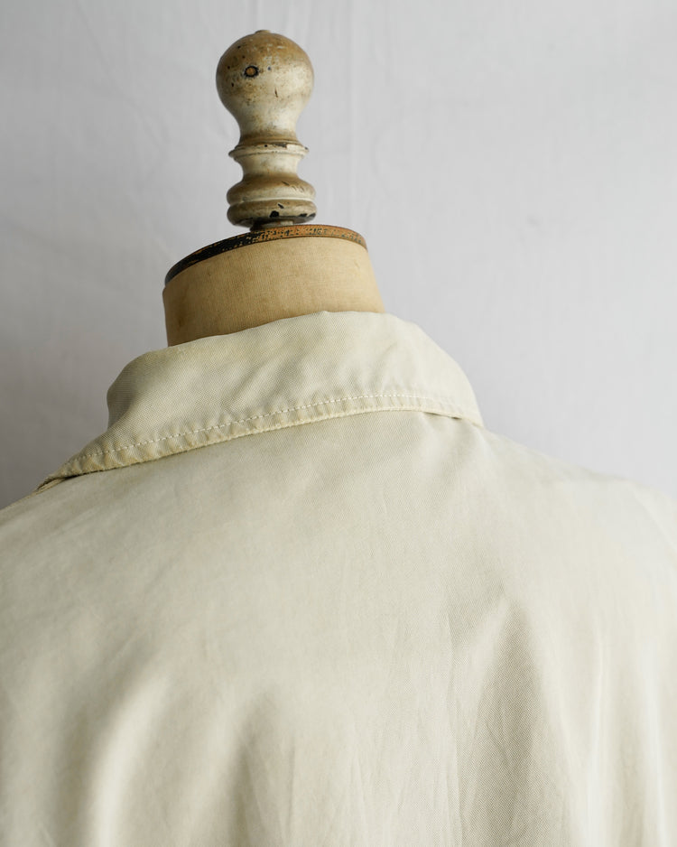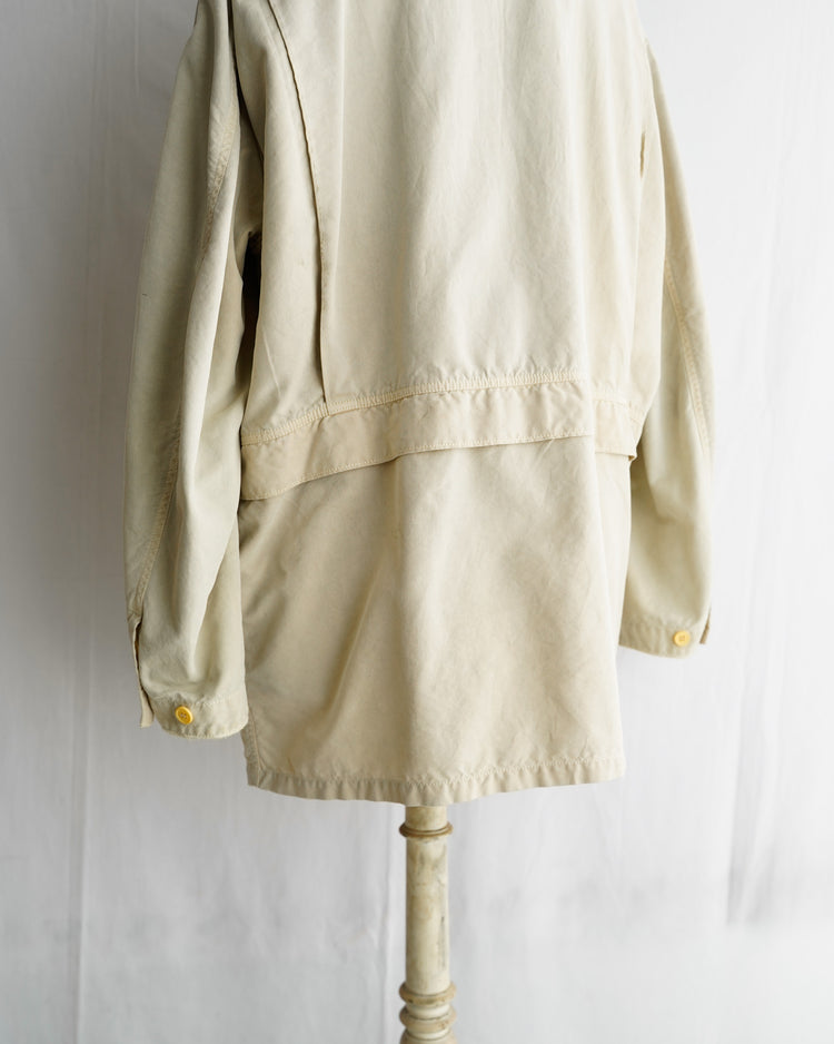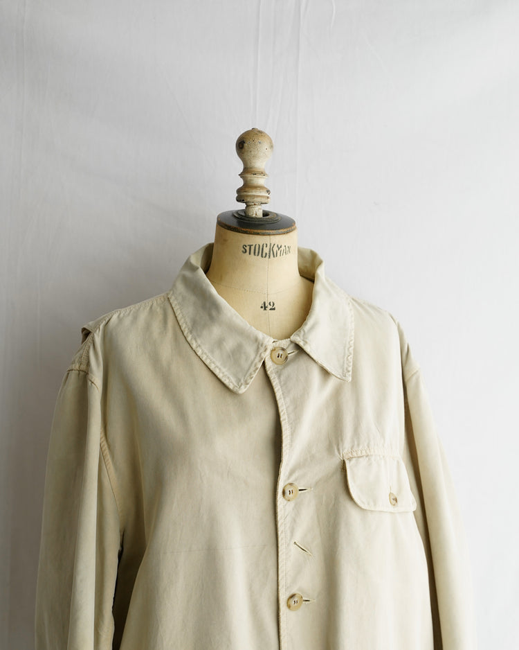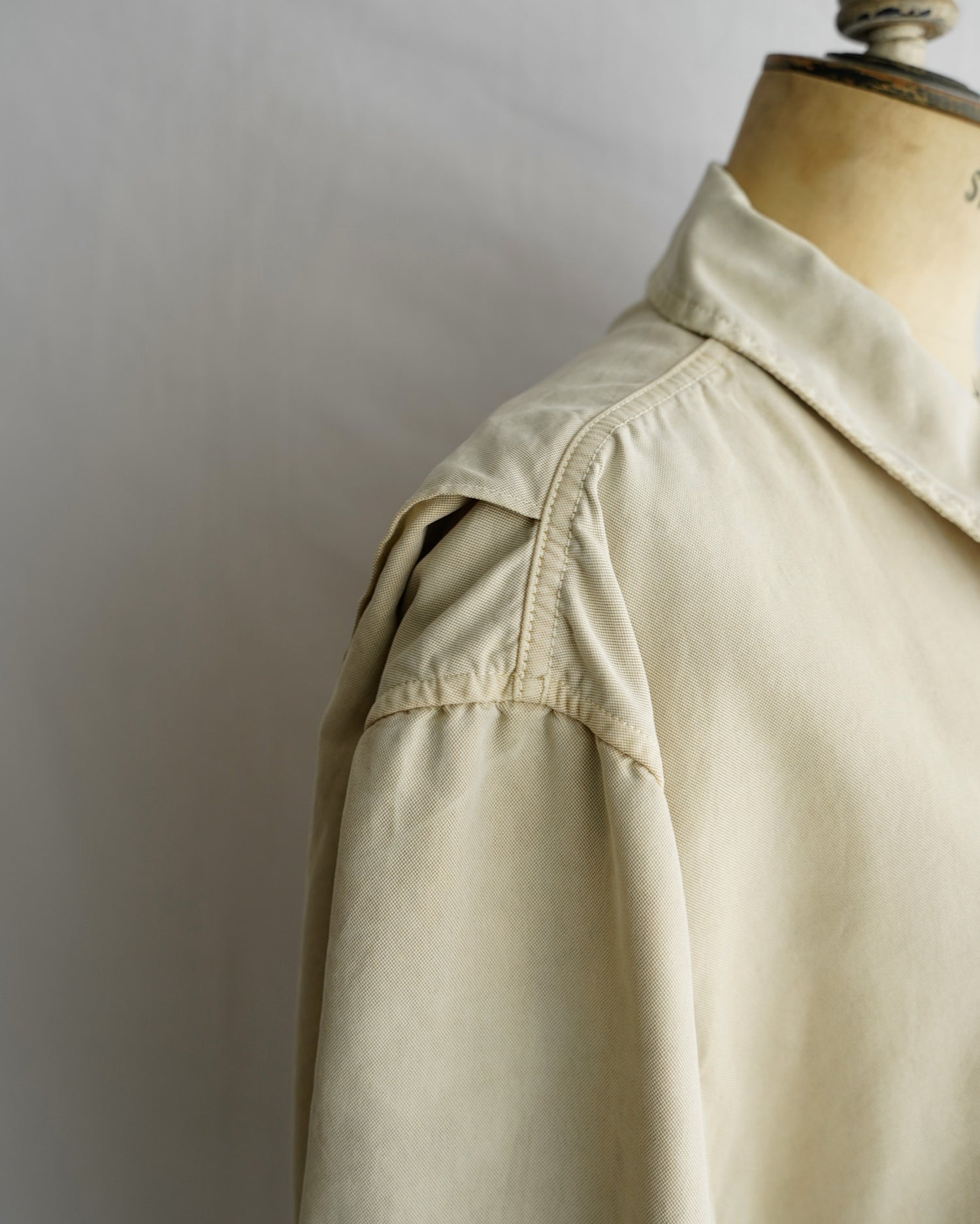 カラーは淡いベージュ。これはフィールドジャケットやハンティングウェアにルーツを持つトーンですが、オスティの手にかかることで土臭さが抑えられ、むしろ洗練された都会的なニュアンスを帯びています。光の加減によって柔らかな陰影を見せるこの色調は、経年変化によってさらに深みを増し、ヴィンテージとしての魅力を強めていきます。現存する個体の多くは色褪せやダメージが見られる中、本品はコンディションも抜群に良好で、当時の雰囲気をそのまま纏うことができる点も大きな価値の一つです。