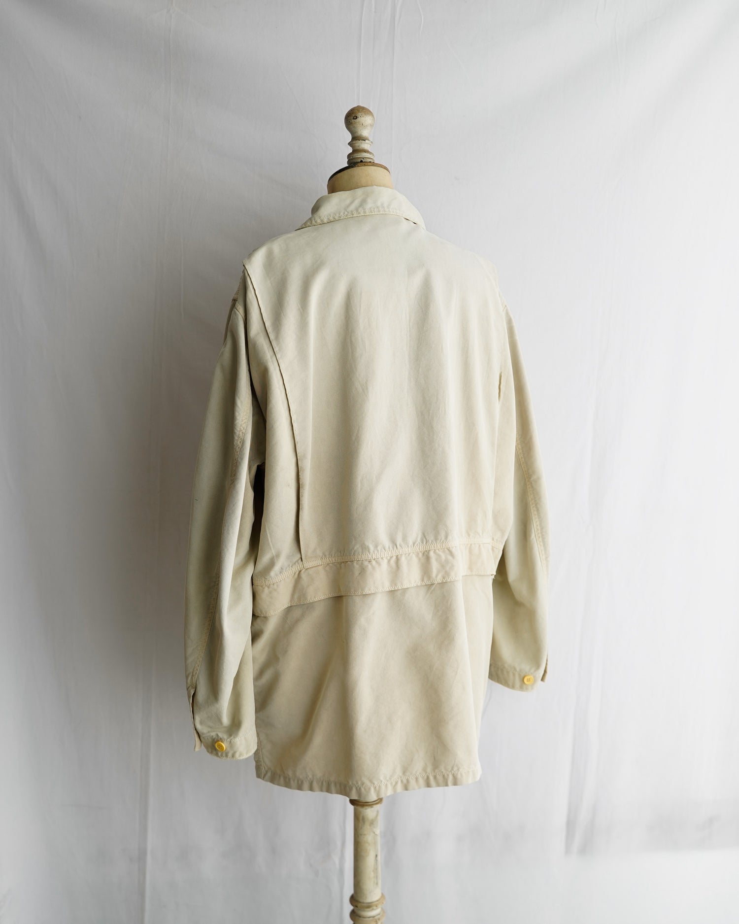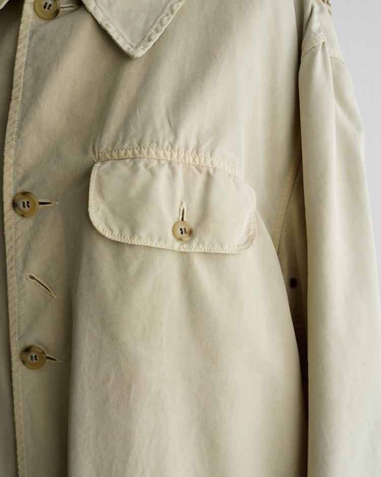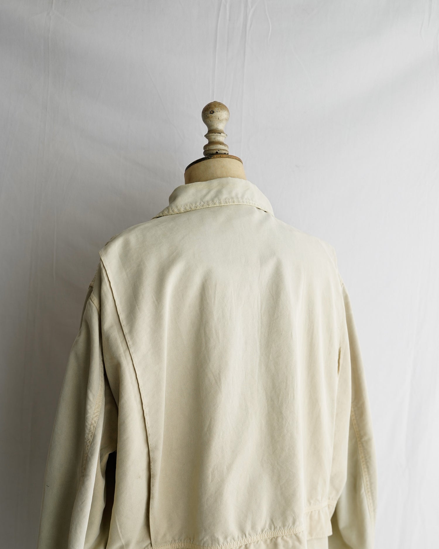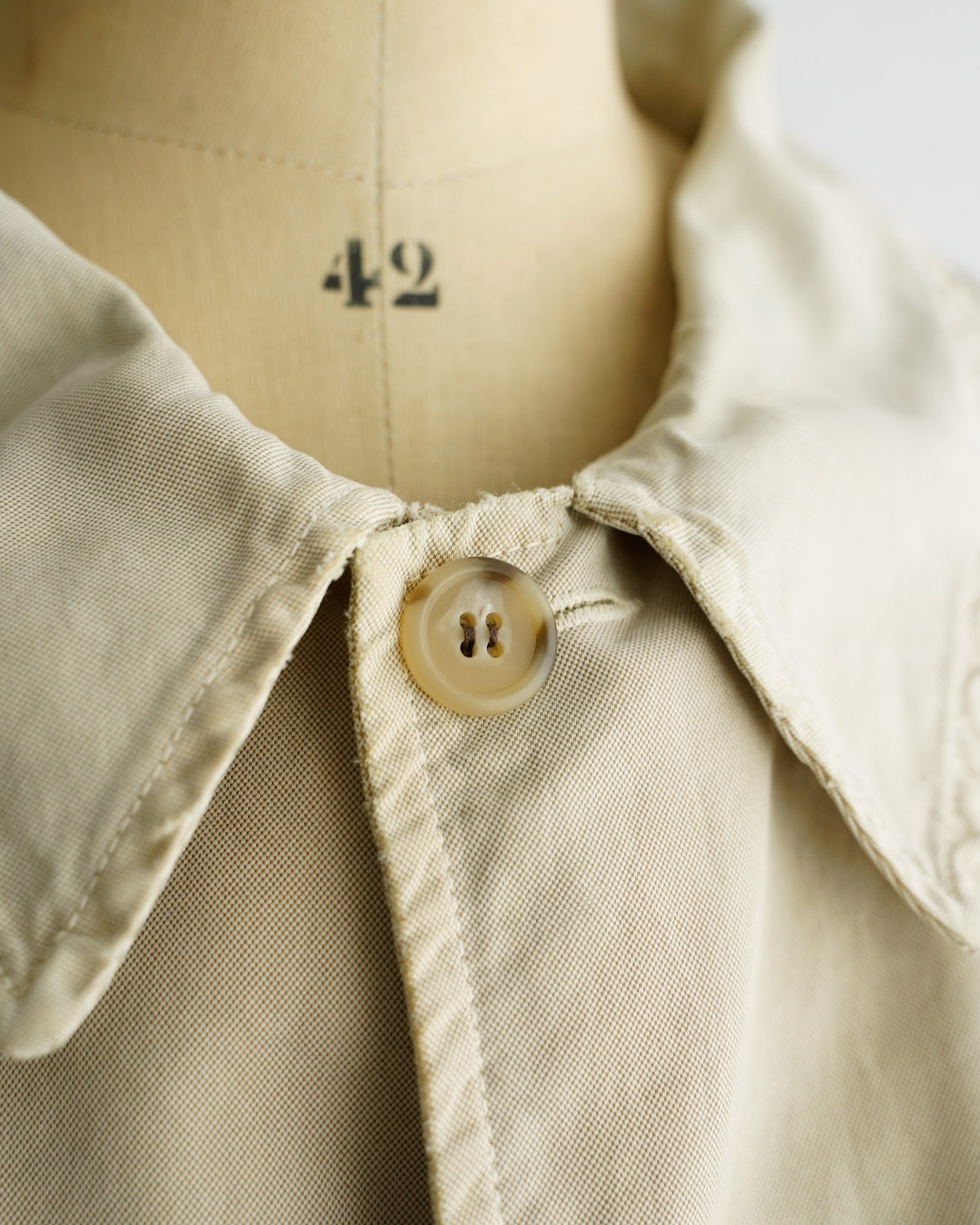 カラーは淡いベージュ。これはフィールドジャケットやハンティングウェアにルーツを持つトーンですが、オスティの手にかかることで土臭さが抑えられ、むしろ洗練された都会的なニュアンスを帯びています。光の加減によって柔らかな陰影を見せるこの色調は、経年変化によってさらに深みを増し、ヴィンテージとしての魅力を強めていきます。現存する個体の多くは色褪せやダメージが見られる中、本品はコンディションも抜群に良好で、当時の雰囲気をそのまま纏うことができる点も大きな価値の一つです。
