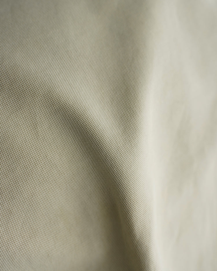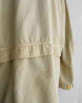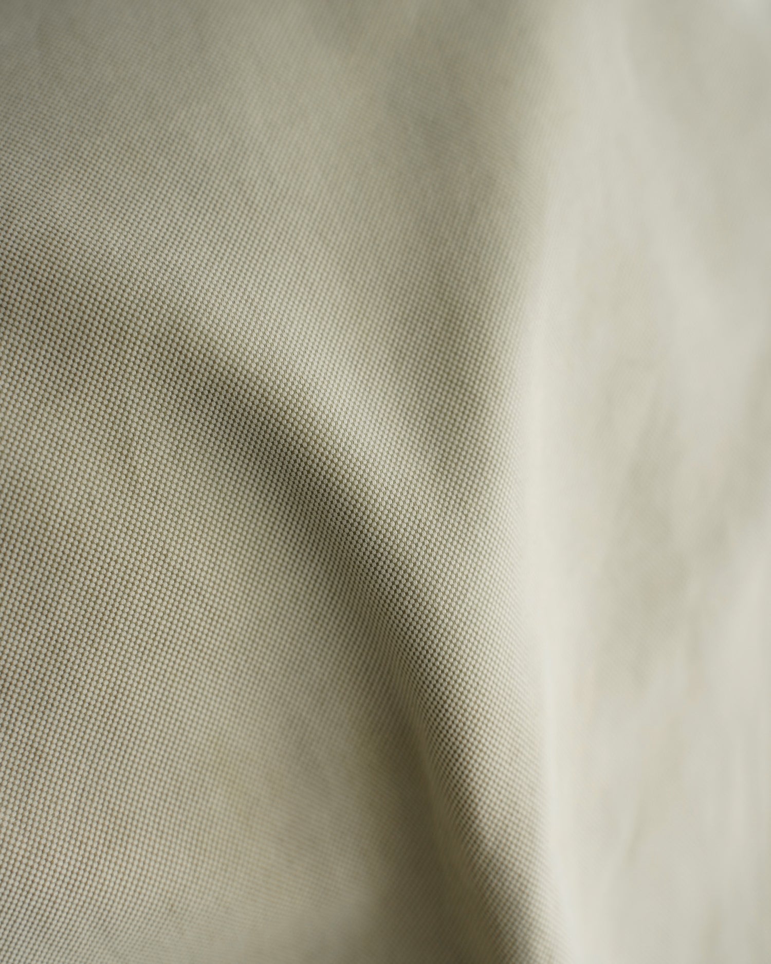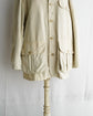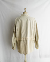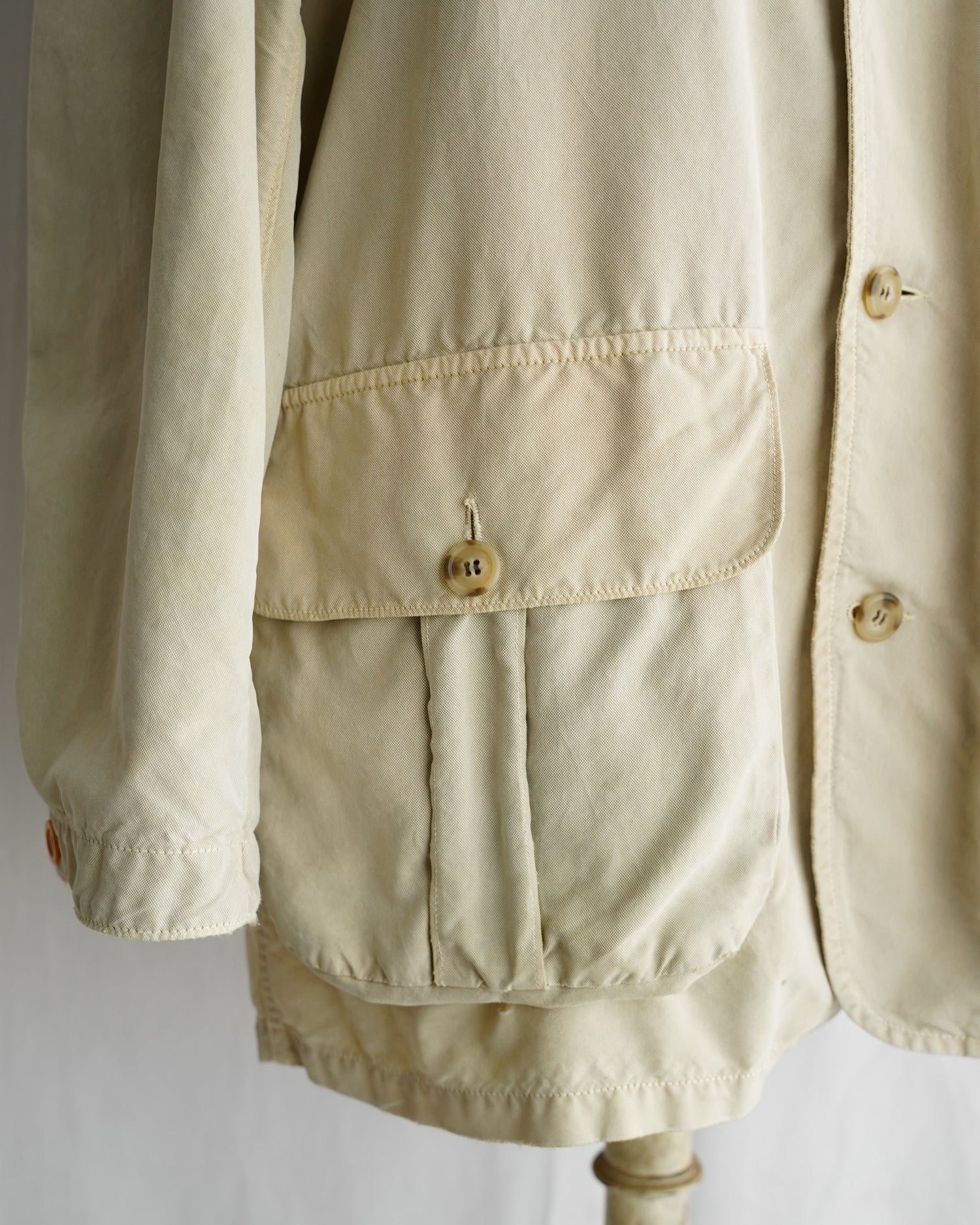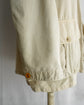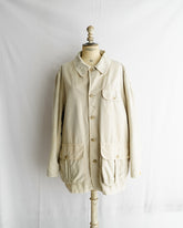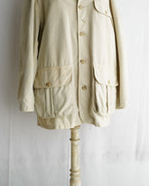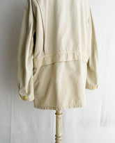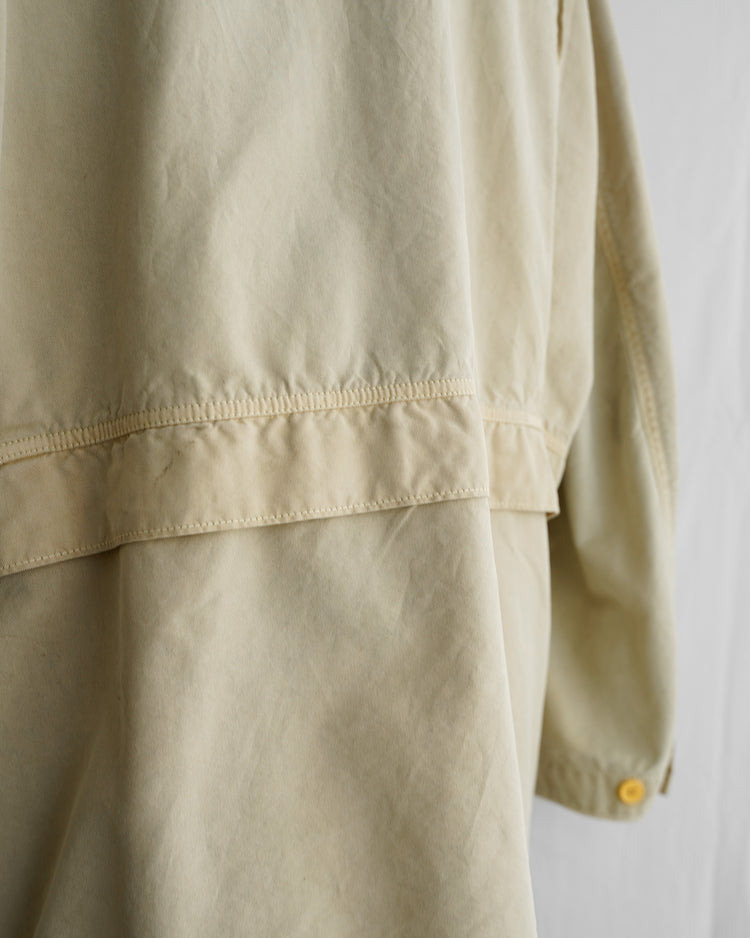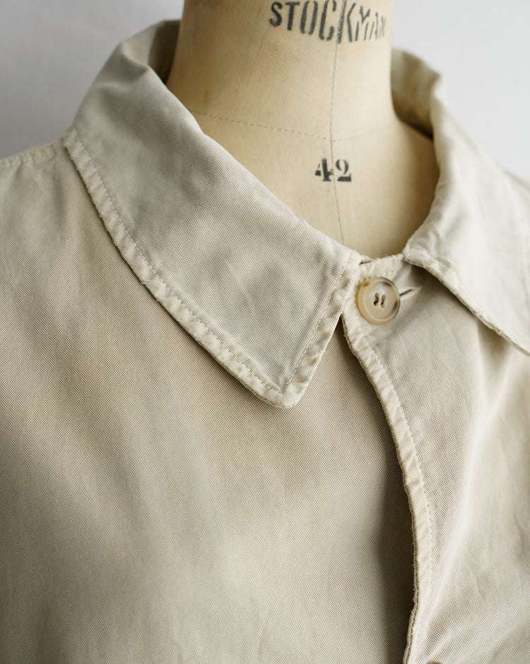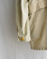 カラーは淡いベージュ。これはフィールドジャケットやハンティングウェアにルーツを持つトーンですが、オスティの手にかかることで土臭さが抑えられ、むしろ洗練された都会的なニュアンスを帯びています。光の加減によって柔らかな陰影を見せるこの色調は、経年変化によってさらに深みを増し、ヴィンテージとしての魅力を強めていきます。現存する個体の多くは色褪せやダメージが見られる中、本品はコンディションも抜群に良好で、当時の雰囲気をそのまま纏うことができる点も大きな価値の一つです。