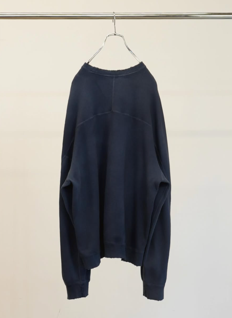 本来は肌着などに使われる肌当たりの良いスムースニットを改良し、太番手の糸を採用して開発することでスウェットに似た表情と心地良い弾力を加えております。染色でベースカラーを作り、さらに色を重ねることで表情に奥行きを持たせ、フェードとダメージでムードを作り込みました。