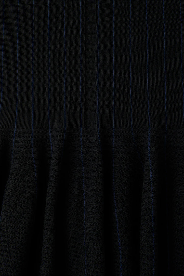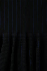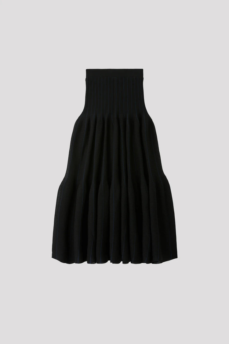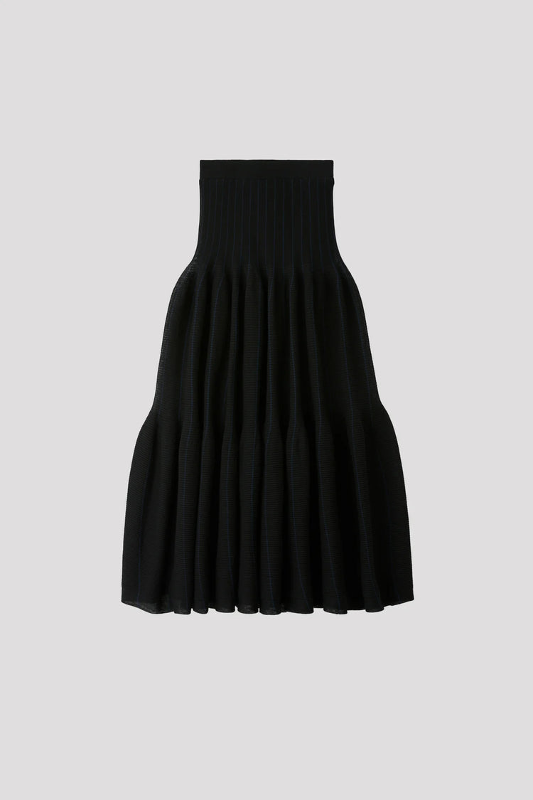 円形のパターン、立体的なギャザーが特徴のスカート。 3Dコンピューター・ニッティングの技術により、縫い代のない仕立てでギャザーを作り出しました。ウエストから広がるたっぷりとしたティアードの広がりがドラマティックな雰囲気を演出。繊細なピンストライプ柄が洗練された印象を与えます。日常から楽に着用できるゴムウエストはストレッチ性に優れ、縫い代がなく、快適な着心地です。
