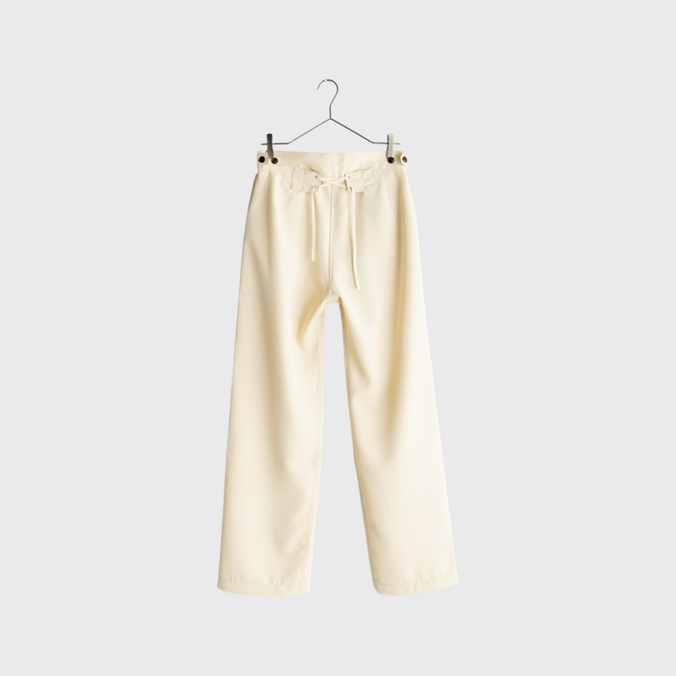 シワになりにくく軽いポリエステル素材を使用したセーラートラウザー。ワイドストレートの綺麗なシルエット。サイドについたボタンとレースアップでサイズ調節ができるので、ハイウエストから腰履きまで気分に合わせた着方を楽しめるアイテムです。