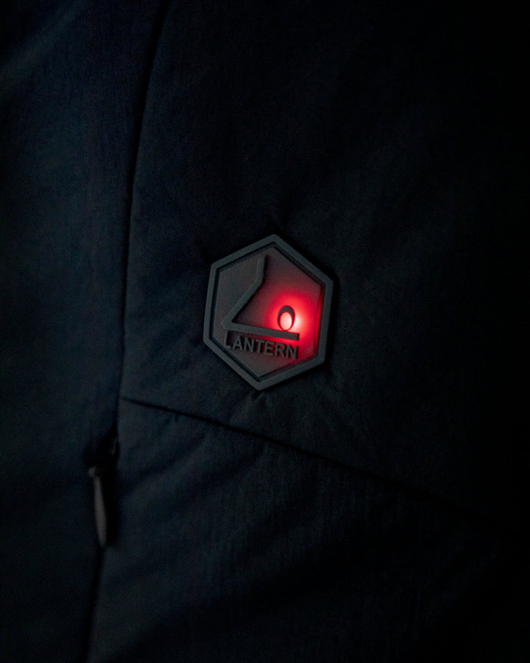 ・後ろ衿付け部分の衿吊りにはブラックリフレクターをレーザーカットしたLANTERNロゴプリントテープを使用。