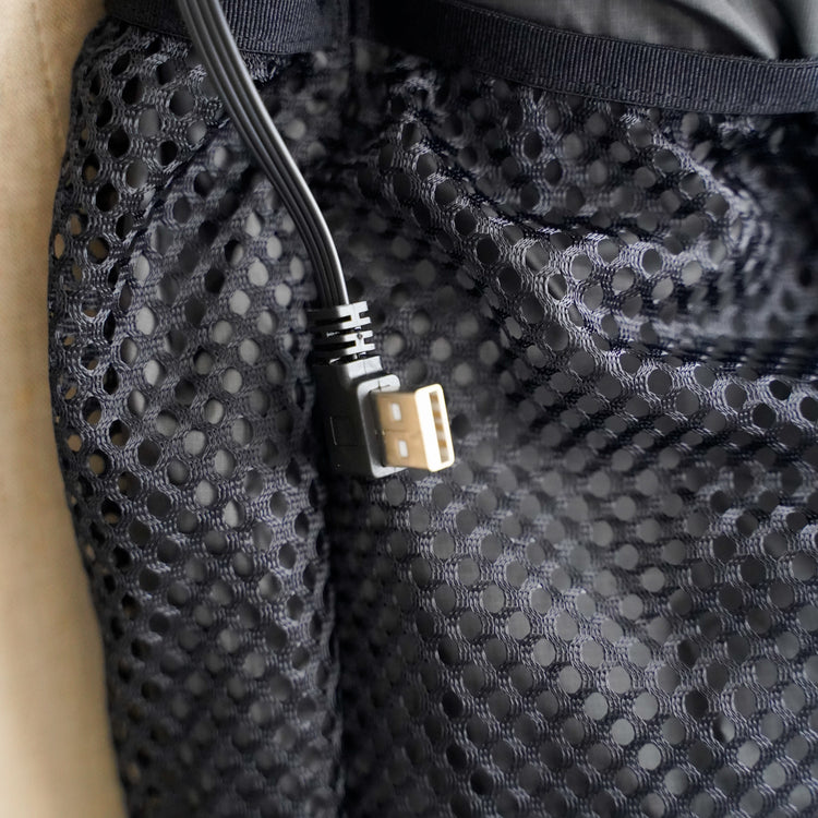 1 : 充電バッテリーを胸元の収納ポケットに入れ、USBプラグを差し込んでください。