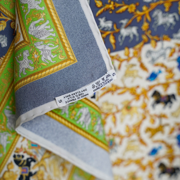 デザイン毎にデッサンをおこし、一色に対して版を作成、色を決定し、職人により丁寧に染色作業が行われ、仕上げの縁取りまで手縫いで作られているHERMESのカレ。