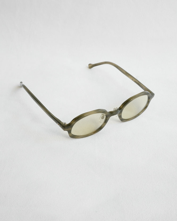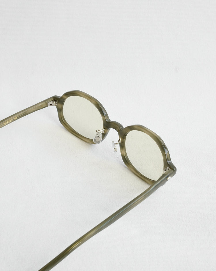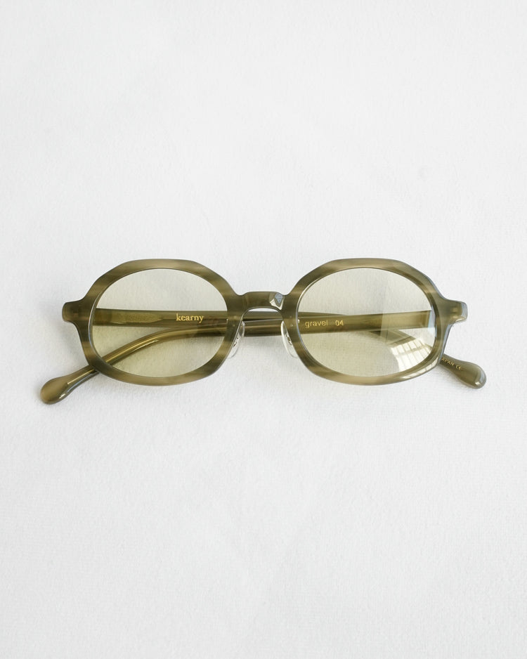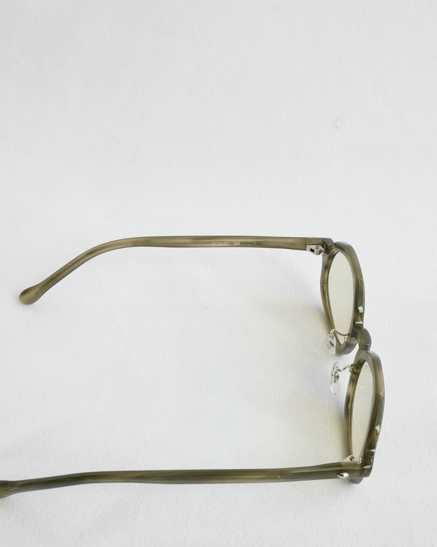 デザイナーの熊谷が佐渡島で出会ったものは石だけではなく、番茶との出会いも”gravel"に影響を与えています。今回のカラーレンズは"green tea"と"coarse tea"の2色。"green tea"が関東の番茶、”coarse tea"が関西の番茶の色を表現しています。関東出身の熊谷は、佐渡島で茶系の”coarse tea"の番茶を飲み、地方によって番茶の色が異なっていることを知りました。眼鏡を通して、日本の文化に触れてほしいという想いも"gravel"には込められています。