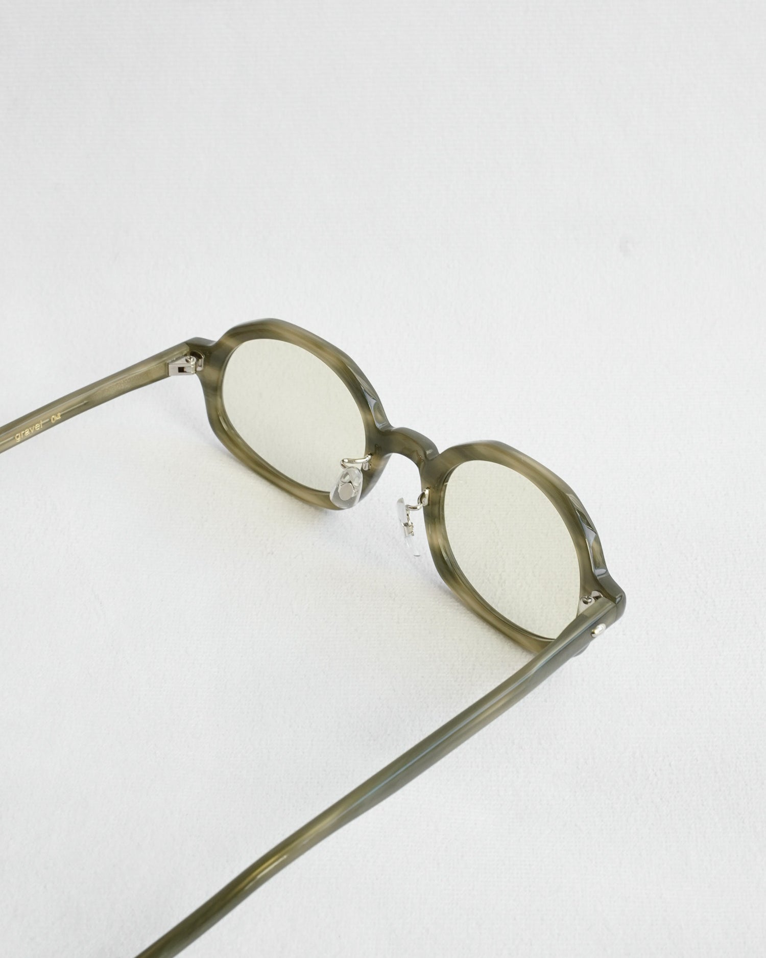 石へのこだわりは生地だけではなく、レンズの形にも反映されています。2種類のレンズの形は佐渡島の石からトレースしたもので、石の形のレンズをベースにして、フレームの形を起こしていくという特殊な手法をとることで、6型のすべての眼鏡で石を表現しています。また、石へのこだわりはテンプルエンドの形やカシメのパーツにも反映されています。”gravel”はディティールまで徹底的に石にこだわったコレクションです。
