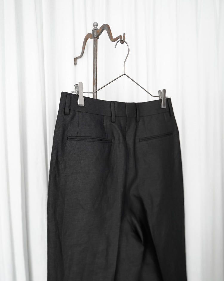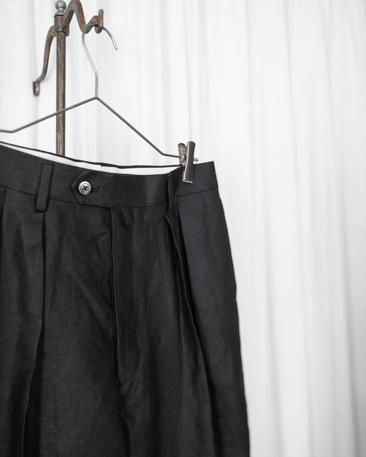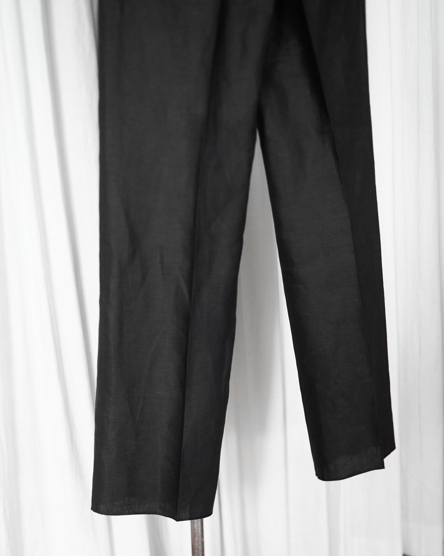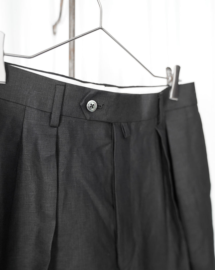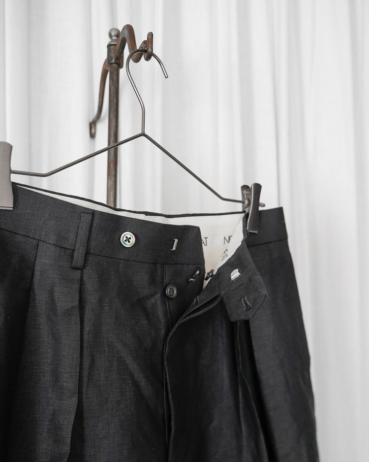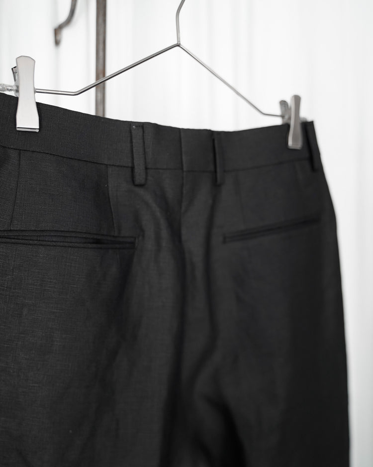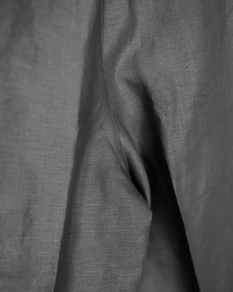 生地は由緒正しき「アイリッシュリネンギルド」にも加盟している、SPENCE BRYSON社のリネンを使用。リネン本来がもつ美しい光沢とハリのある風合いを特徴としており、またドライタッチで清涼感があるので日本の夏に適しております。着用するうちに繊維が柔らかく馴染み、リネン特有の経年変化もお楽しみ頂けます。