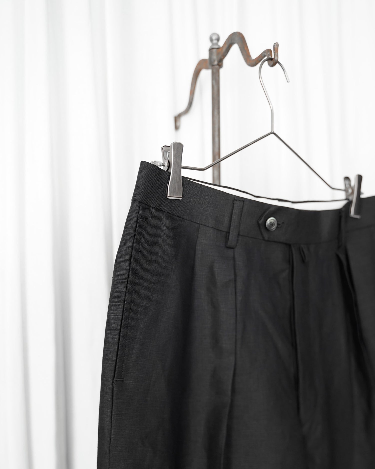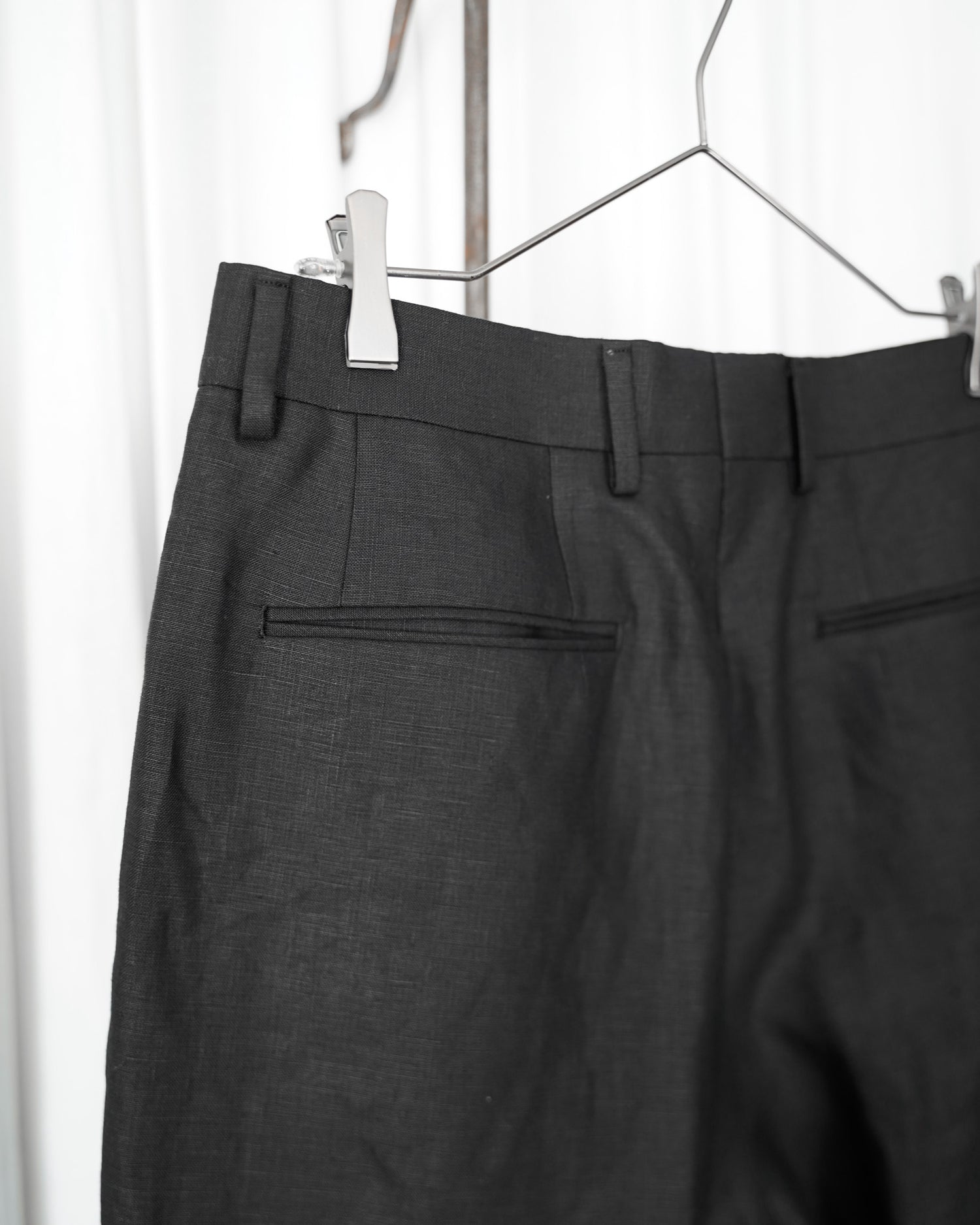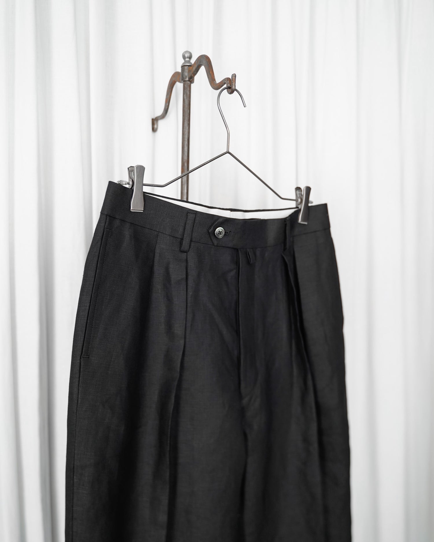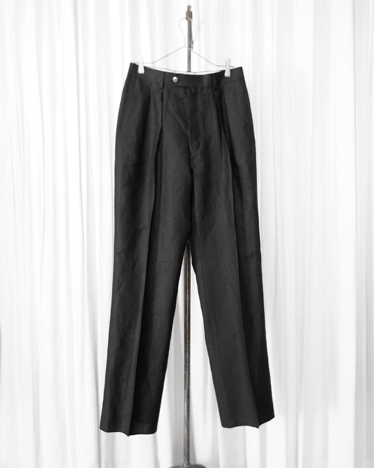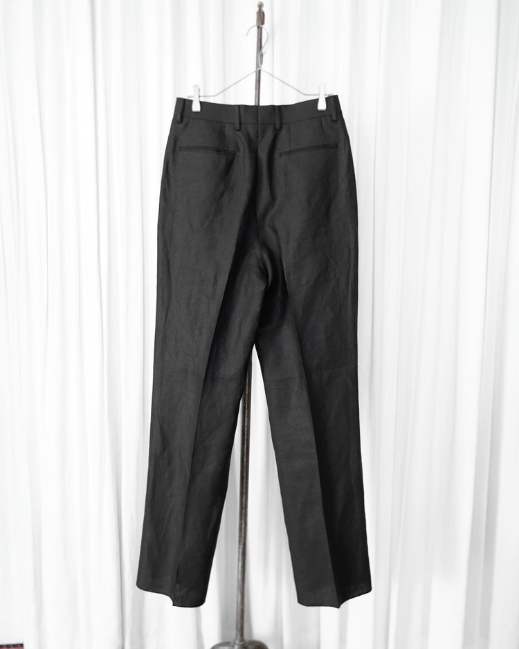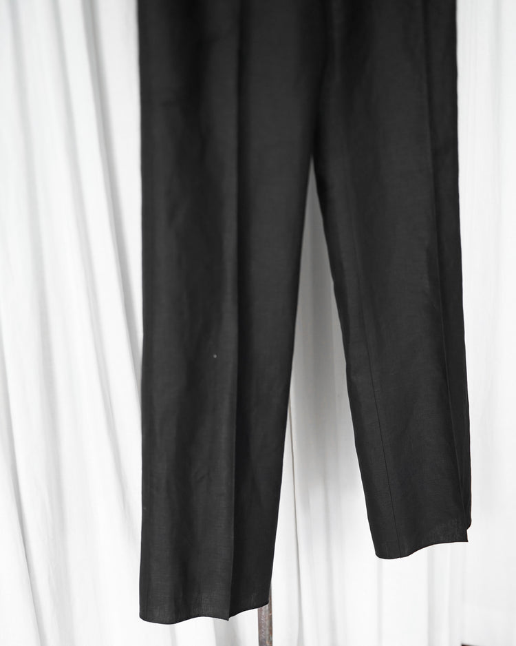 生地は由緒正しき「アイリッシュリネンギルド」にも加盟している、SPENCE BRYSON社のリネンを使用。リネン本来がもつ美しい光沢とハリのある風合いを特徴としており、またドライタッチで清涼感があるので日本の夏に適しております。着用するうちに繊維が柔らかく馴染み、リネン特有の経年変化もお楽しみ頂けます。