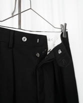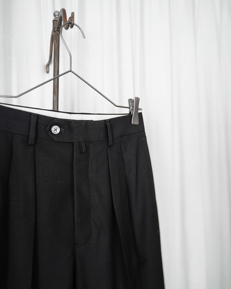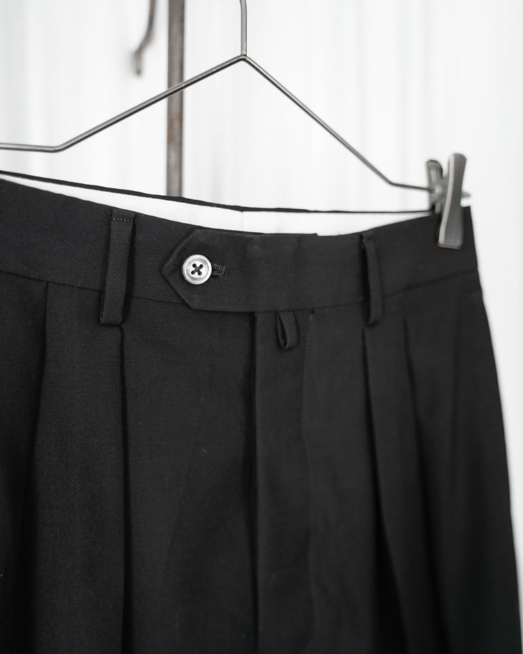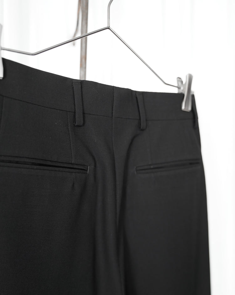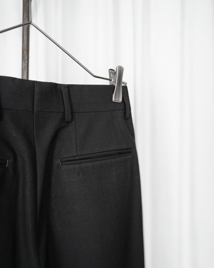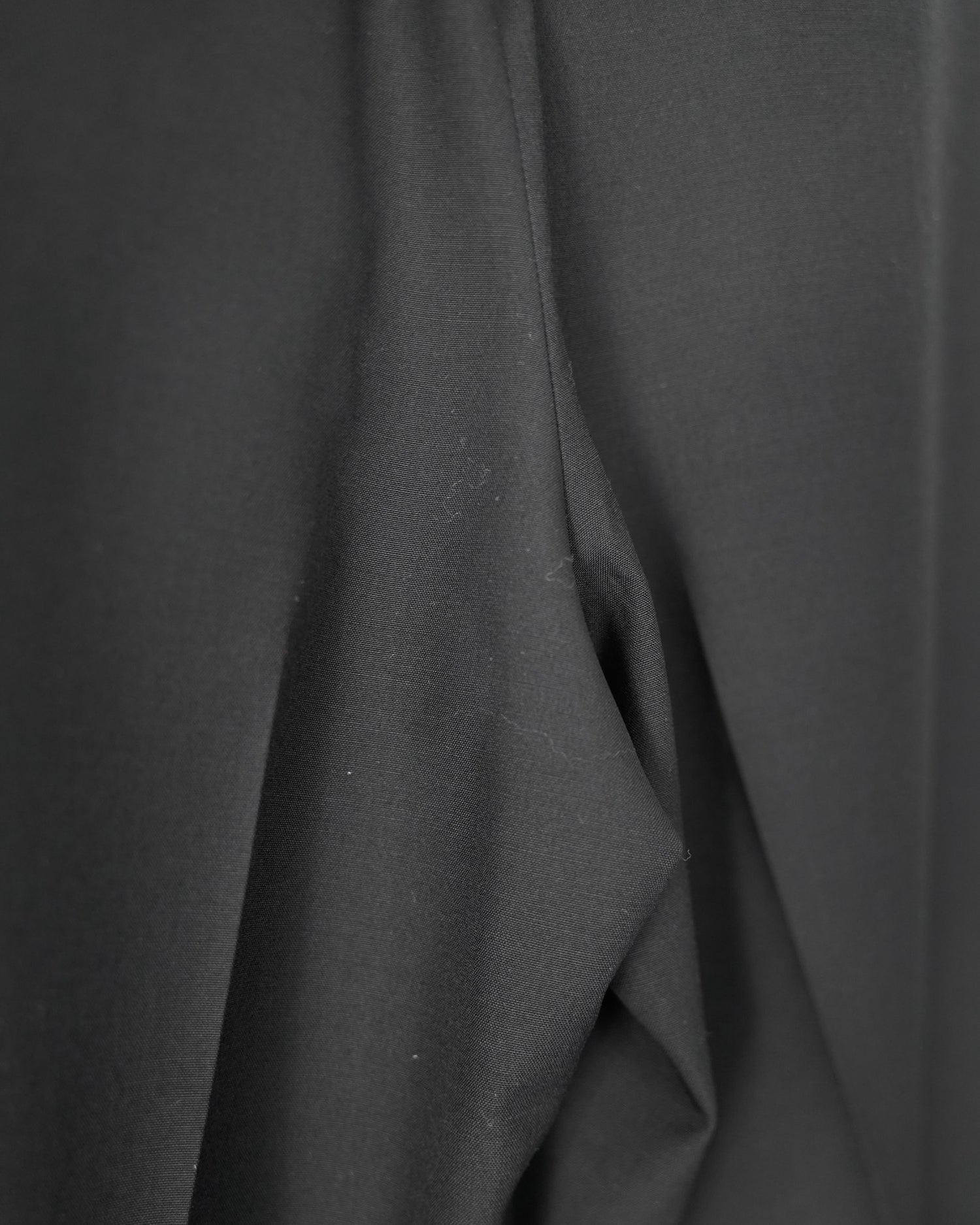 平織りながらタテ糸の密度がヨコ糸に比べておよそ1.3倍になっているウールポプリン生地になります。 使用している糸はタテヨコともにメリノウール(2/60)とオーソドックスですが、仕立て映えや耐久性に優れた糸番手となっております。 また低速織機で丁寧に織り上げられることによりウールの膨らみと滑らかさを活かしており、ポプリンならではのハリコシと僅かに見える横畝と独特の光沢感が特徴的な一着です。