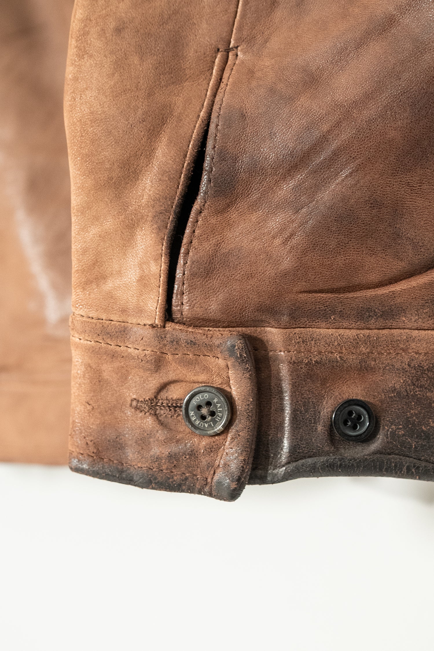 中でもこちらのラムレザーシングルジャケットは、90sラルフ黄金期を象徴する名作。ラムレザー特有の「軽く、柔らかく、ストレスなく羽織れる」特徴は、本革初心者にも驚きの着心地を与えてくれます。重厚な見た目と裏腹に、驚くほど軽快。肩にのる重さがほとんどなく、まるで自分の皮膚がもう一枚増えたような一体感があります。この感覚はラムならでは。大人のレザージャケットとして理想的なバランスです。