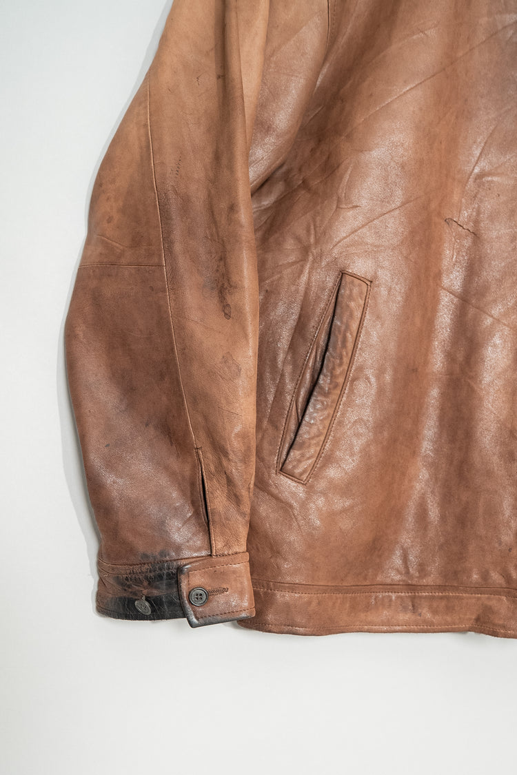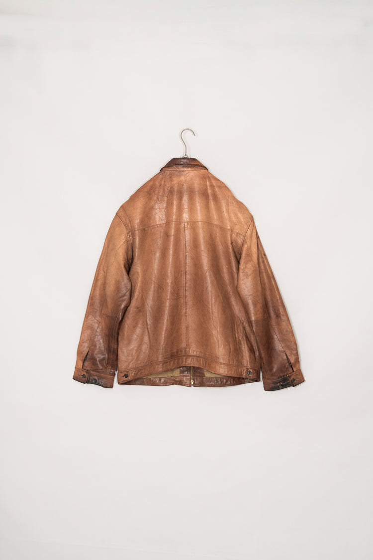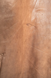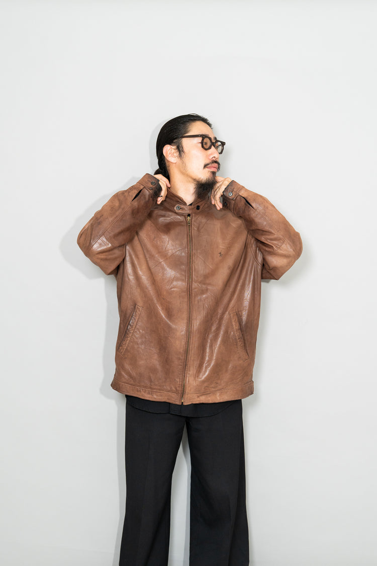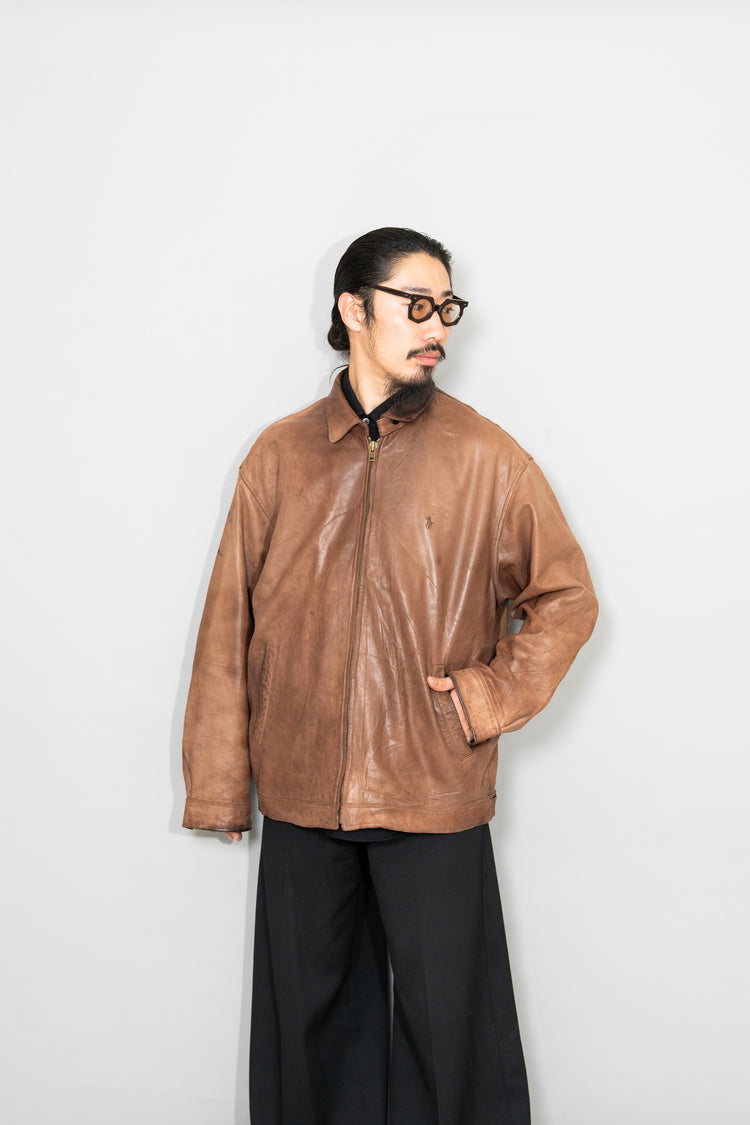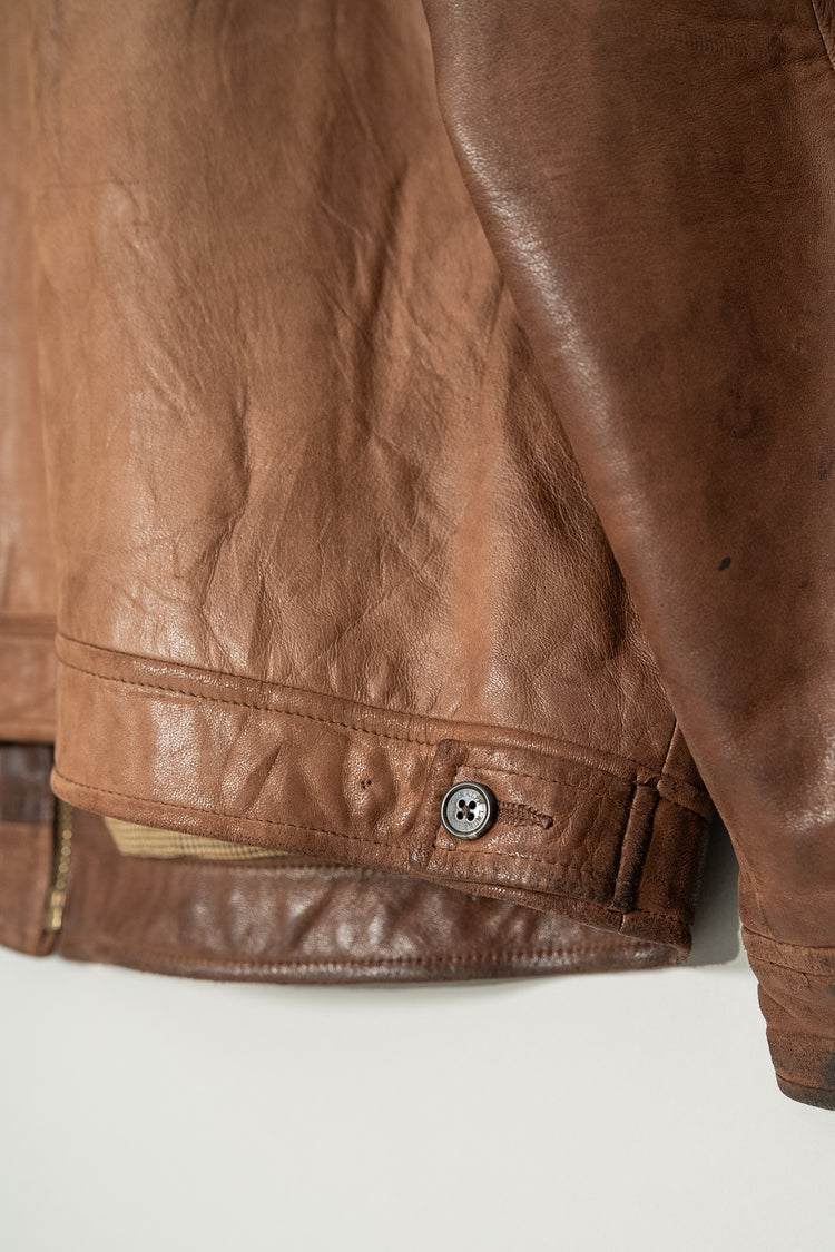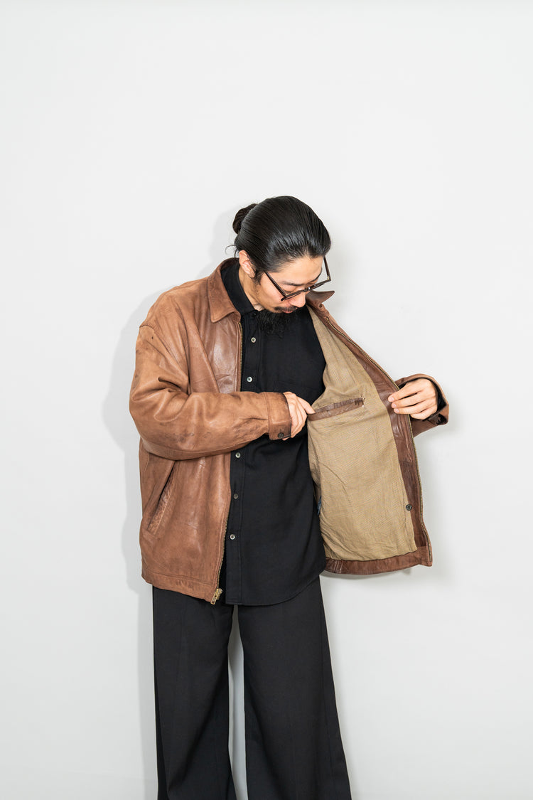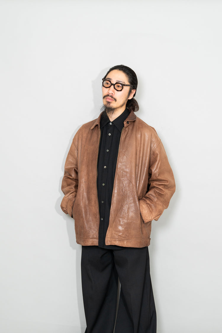 そして最大の特徴は、年月を重ねて生まれた土っぽい褪色と、深い皺が織り成す唯一無二のエイジング。肩から袖にかけて、まるで砂漠のようにゆっくりと色が焼けていったこの表情は新品では絶対に再現できません。レザーが生きてきた時間を纏う魅力、これこそヴィンテージの醍醐味です。