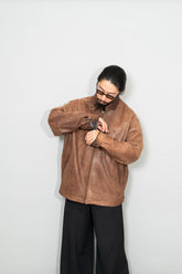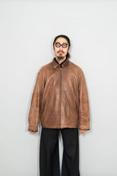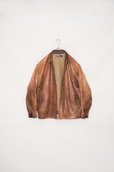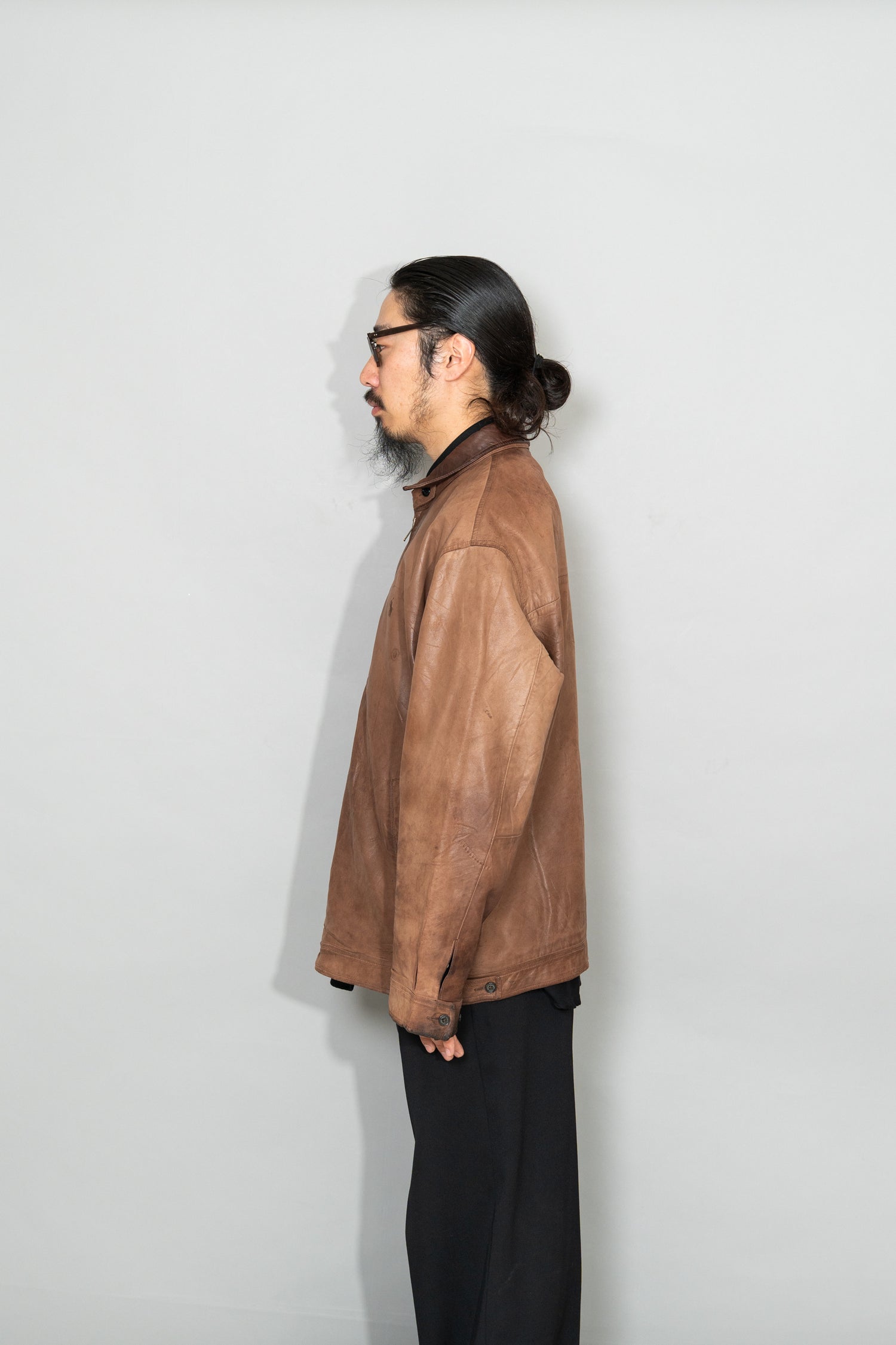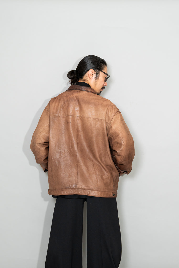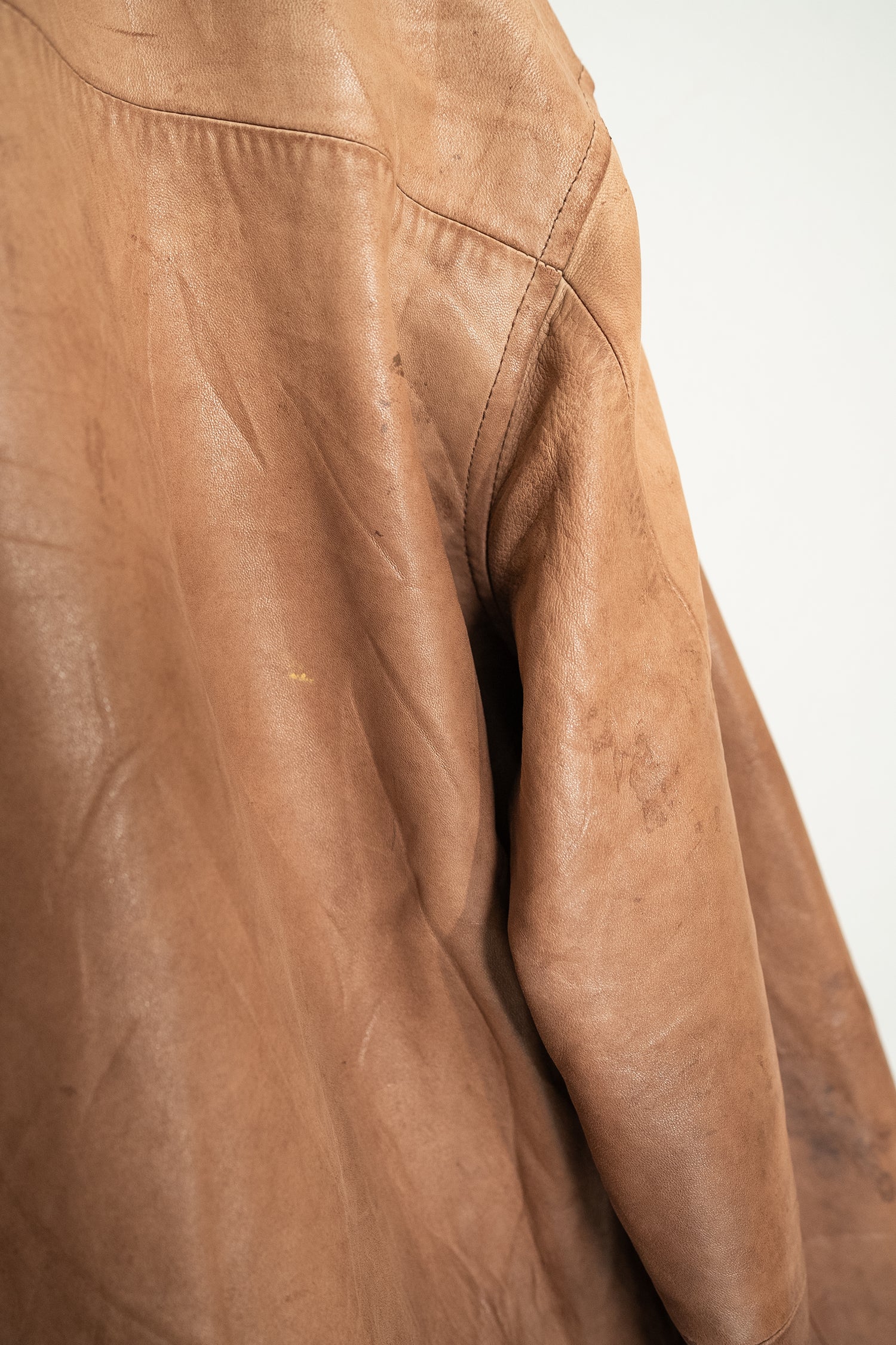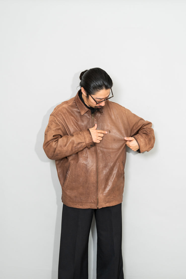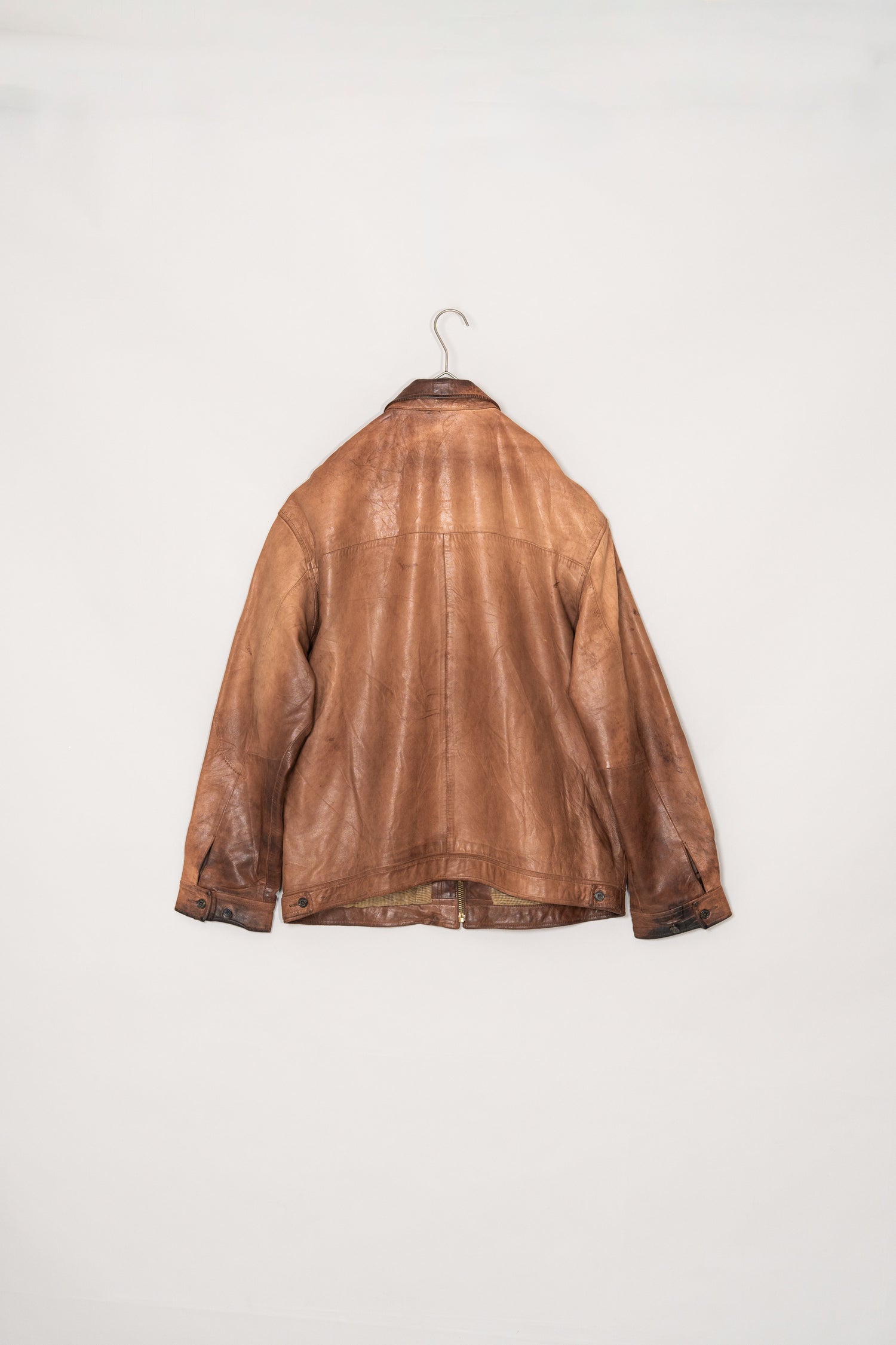 そして最大の特徴は、年月を重ねて生まれた土っぽい褪色と、深い皺が織り成す唯一無二のエイジング。肩から袖にかけて、まるで砂漠のようにゆっくりと色が焼けていったこの表情は新品では絶対に再現できません。レザーが生きてきた時間を纏う魅力、これこそヴィンテージの醍醐味です。
