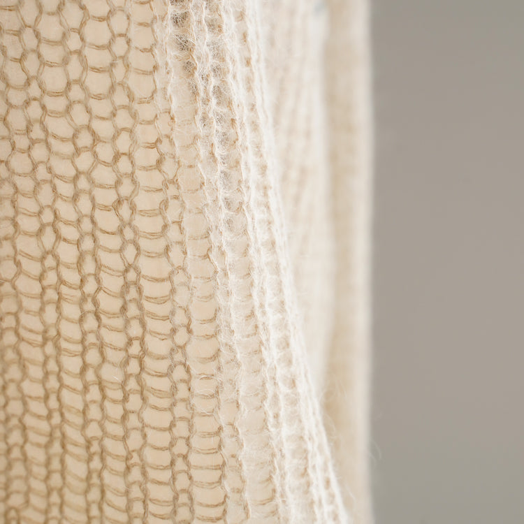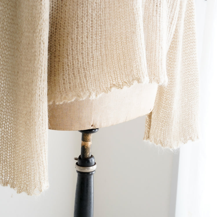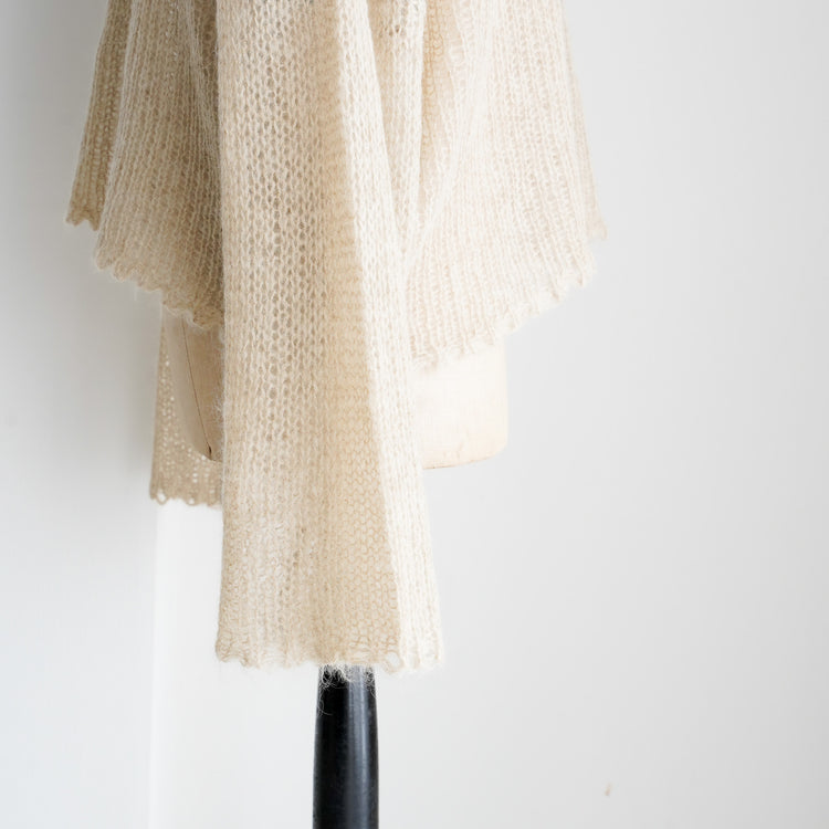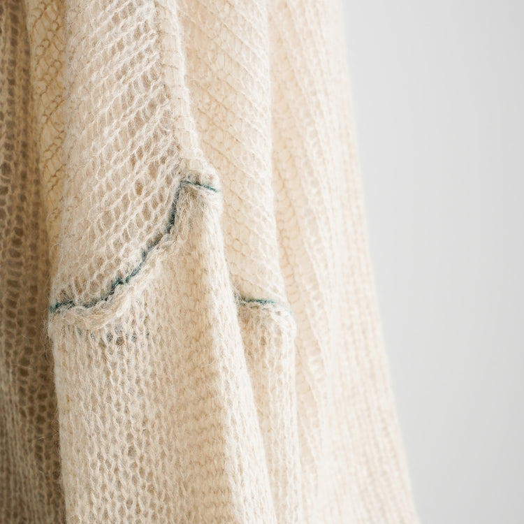 ナイロン・モヘア・ウールをミックスした糸を使用し、保温性がありながらも、軽さ・透け感を出し、 ユニセックスな風合いに仕上げられています。 ボディーのカラーによって異なるアクセントカラーの糸でリンキングを施し、動きとともに顔が除く遊び心 が見え隠れする、ユニセックスな1枚です。