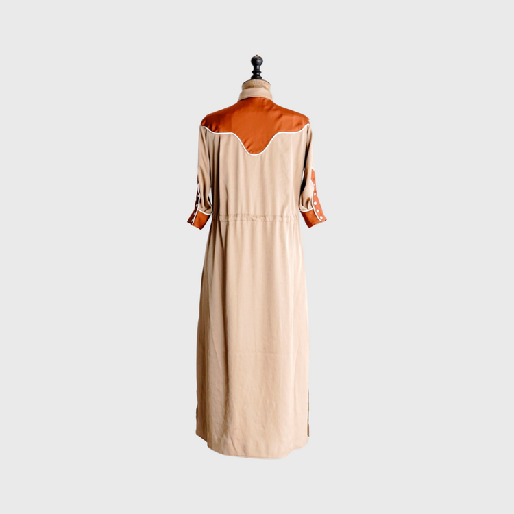 ウェスタンシャツを女性らしいサテン素材に落とし込んだ1着。波打つヨークの切替えや配色のパイピングがアクセントとなった印象的なデザインが目を惹きます。前を閉めてワンピースとしてはもちろん、タンクトップの上からサラッと羽織としてもお使いいただけるアイテムです◎